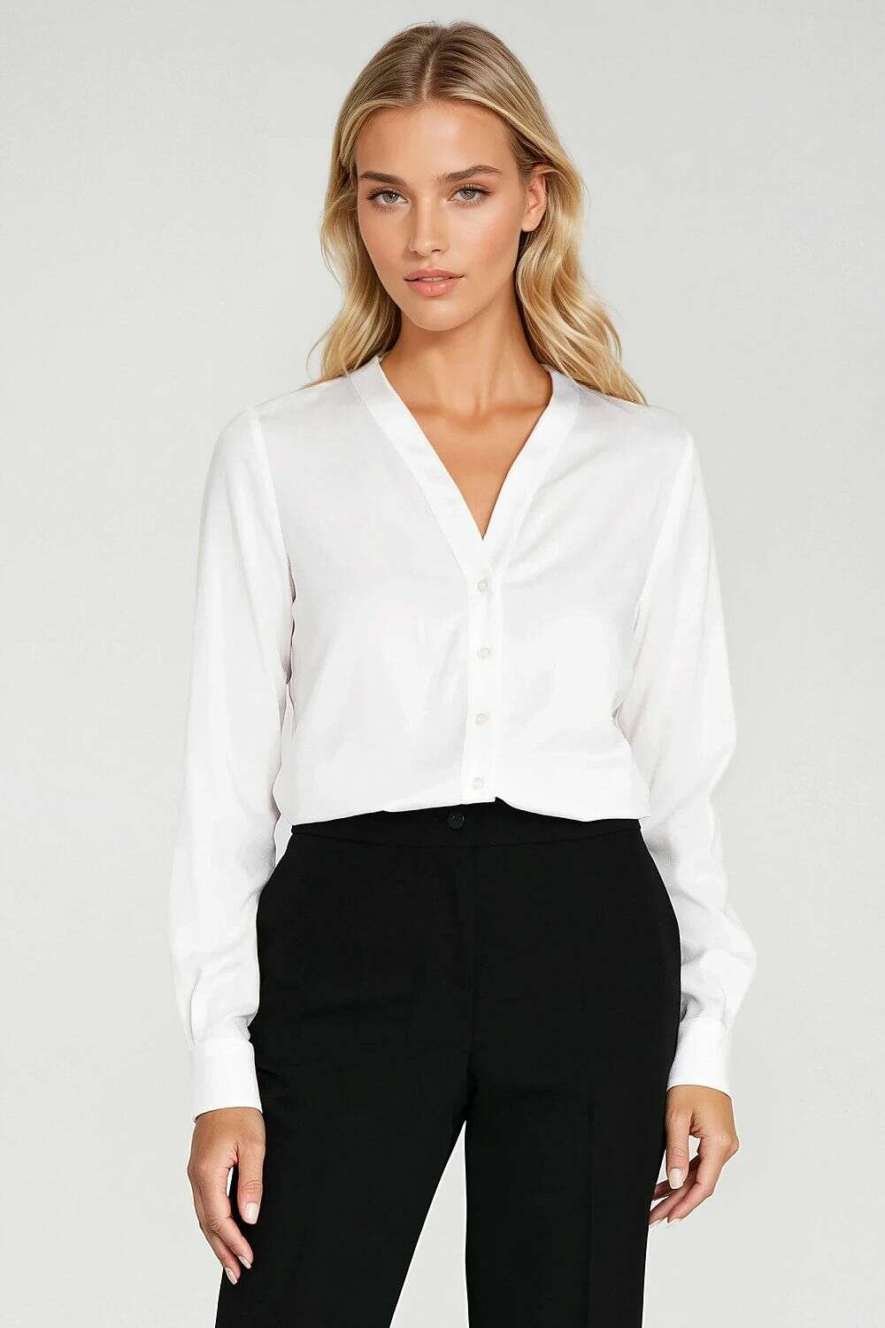Elegant women's shirt in a blouse cut in a regular style made of light and breathable viscose. The model has a V-neckline, which optically slims the silhouette and adds subtle elegance. The shirt is buttoned, has long sleeves with cuffs, and does not have a collar, giving it a modern, minimalist character. It will work perfectly in both casual stylizations and more formal combinations.