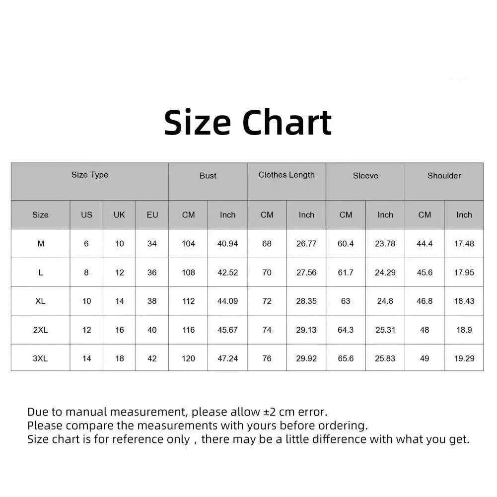 - 3XL: Bust: 122cm, Length: 74cm, Sleeve: 65cm, Shoulder: 50.5cm
