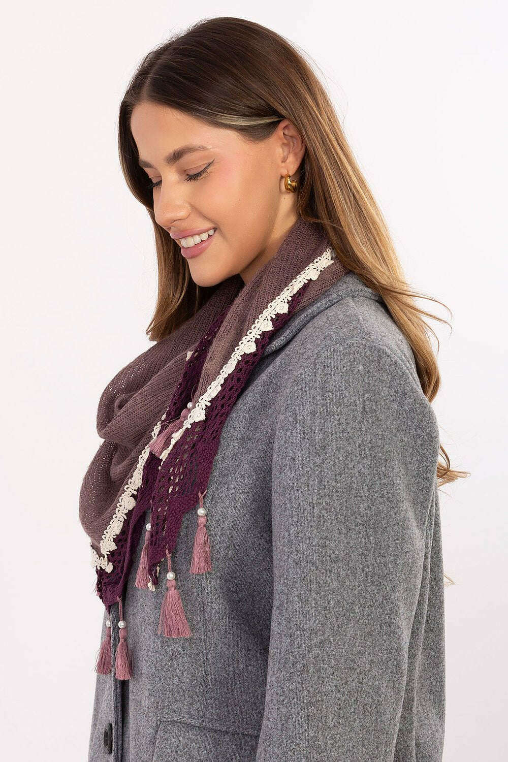 Neckerchief Model 220384 — an elegant, lightweight triangular scarf crafted from 100% viscose. The delicate texture and lace detailing create a romantic touch that enhances both everyday outfits and special occasions.