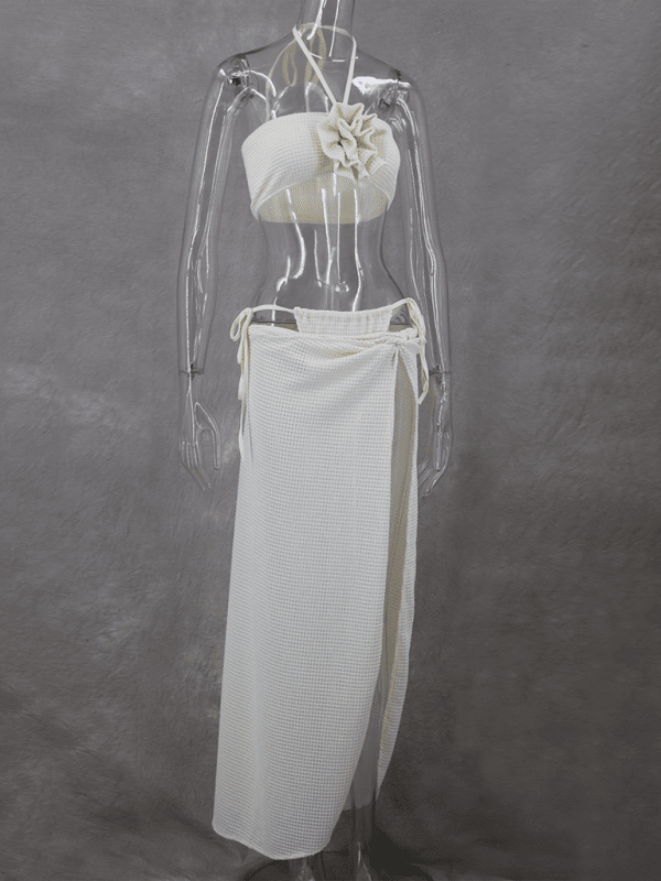 New sexy hot girl sleeveless tube top halter collar knitted slit high waist skirt three-piece suit