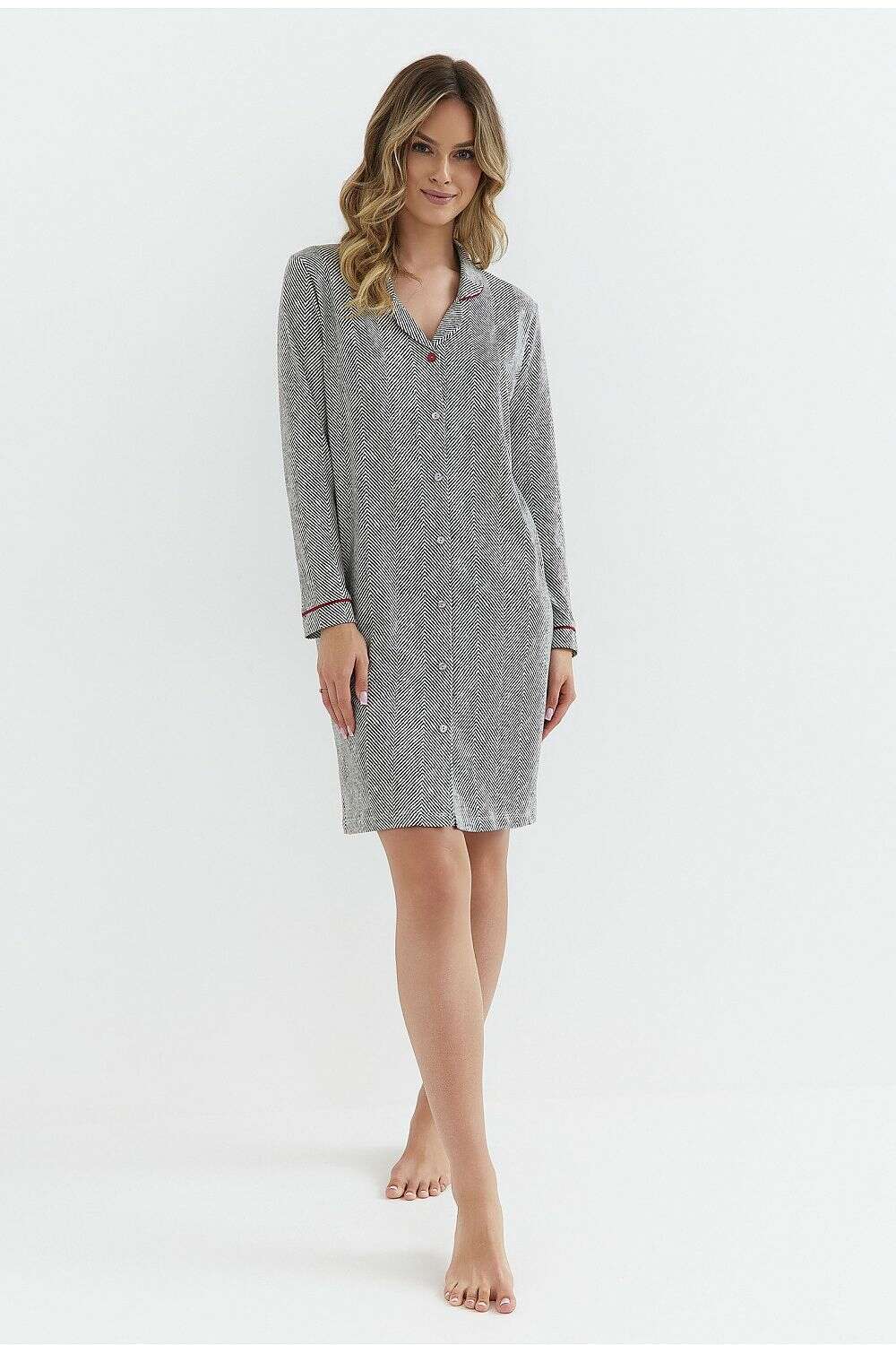 The elegant women's nightshirt in a shirt style is a combination of class and comfort. Made of soft, breathable fabric, it ensures comfort throughout the night. The loose cut guarantees freedom of movement, and the button closure makes it easy to put on. The shirt has a classic collar, long sleeves with cuffs, and subtle, elegant piping finishes that add sophistication to the whole. It is a perfect choice for women who appreciate comfort in a stylish edition.