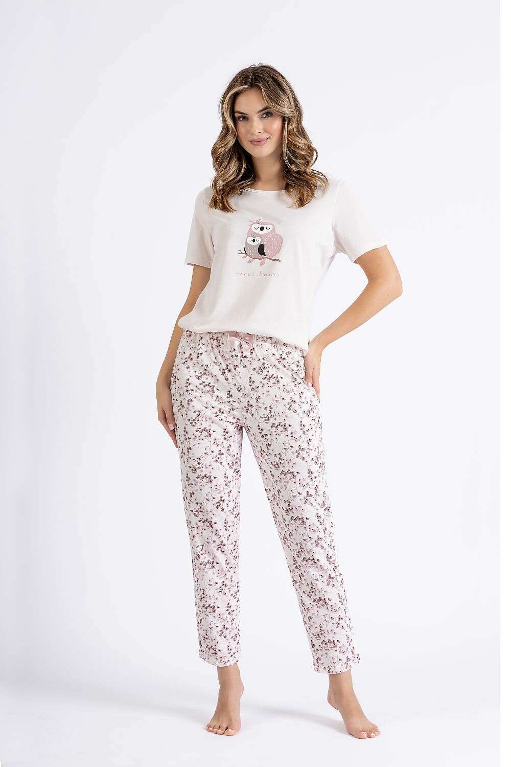 Women's pajamas perfect for everyday wear. The short-sleeved blouse with a round neckline and decorative print provides a comfortable, loose fit that does not restrict movement. Made of soft and breathable fabric, it is pleasant to the touch and ideal for every night. The 7/8 length pants with a print, kept in subdued colors, are pocketless, which adds simplicity to them. The waistband elastic and decorative bow emphasize the feminine character of the pajamas, and the soft material ensures comfort.