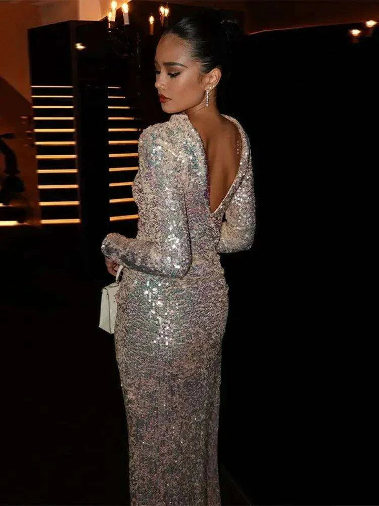Glistening Backless Maxi Dress: Elegant Sequin Evening Gown with Long Sleeves