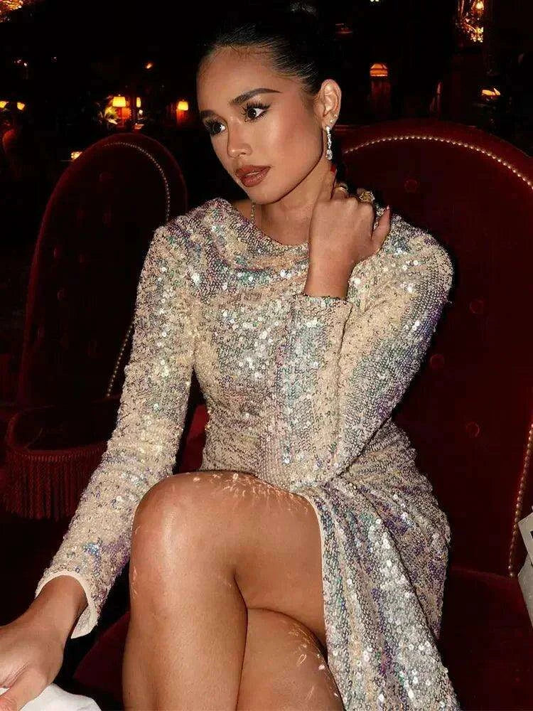 • Elegant Design: Adorned with shimmering sequins, this gown showcases a sophisticated O-neck, long sleeves, and a daring backless detail that leaves a lasting impression.
