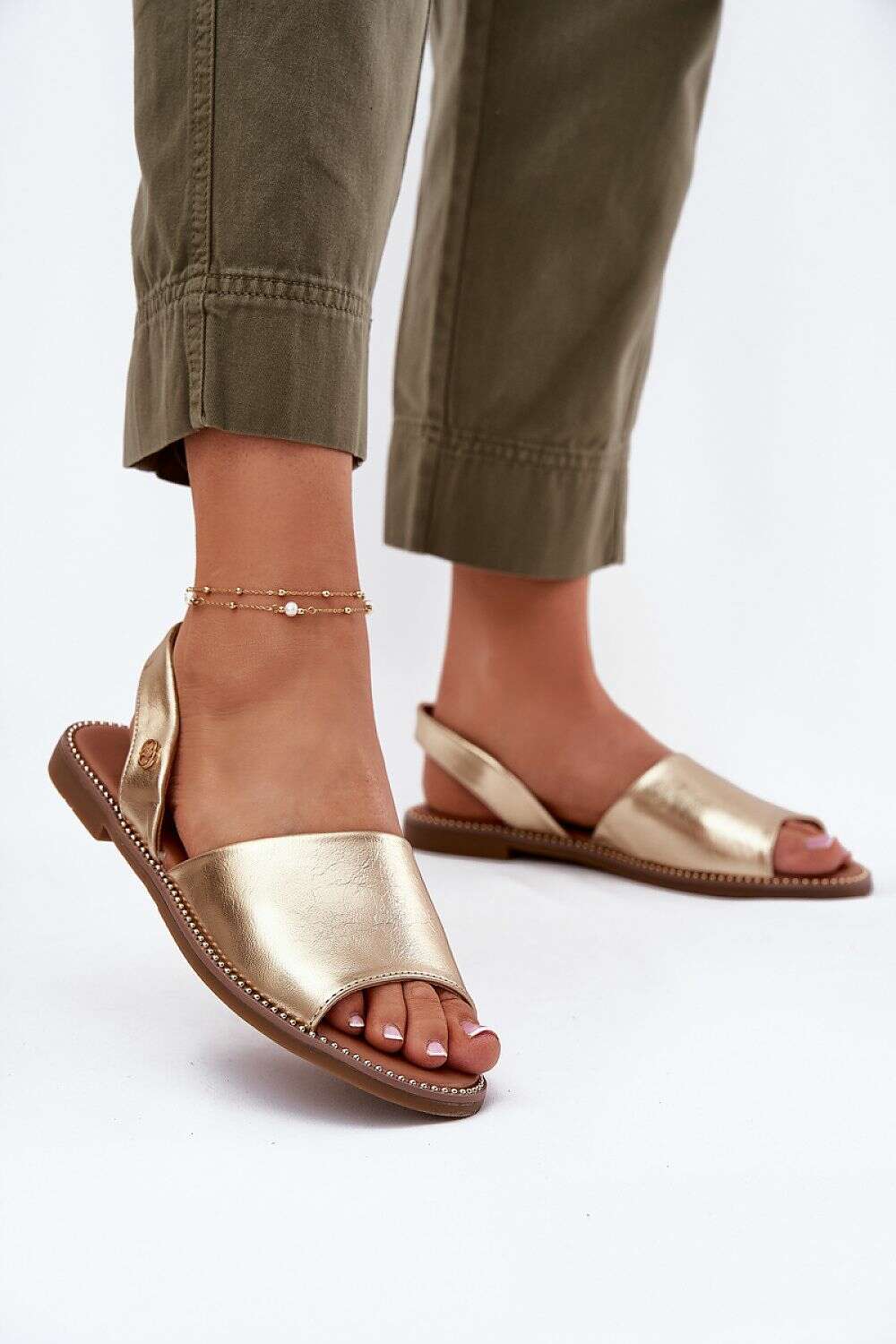 Women's sandals made of eco leather are an elegant proposition for warm days. Set on a flat heel, they provide comfort throughout the day. A subtle decorative detail is located on the back strap, adding charm. Perfect for dresses, skirts, and material pants, they are an excellent addition to summer outfits.