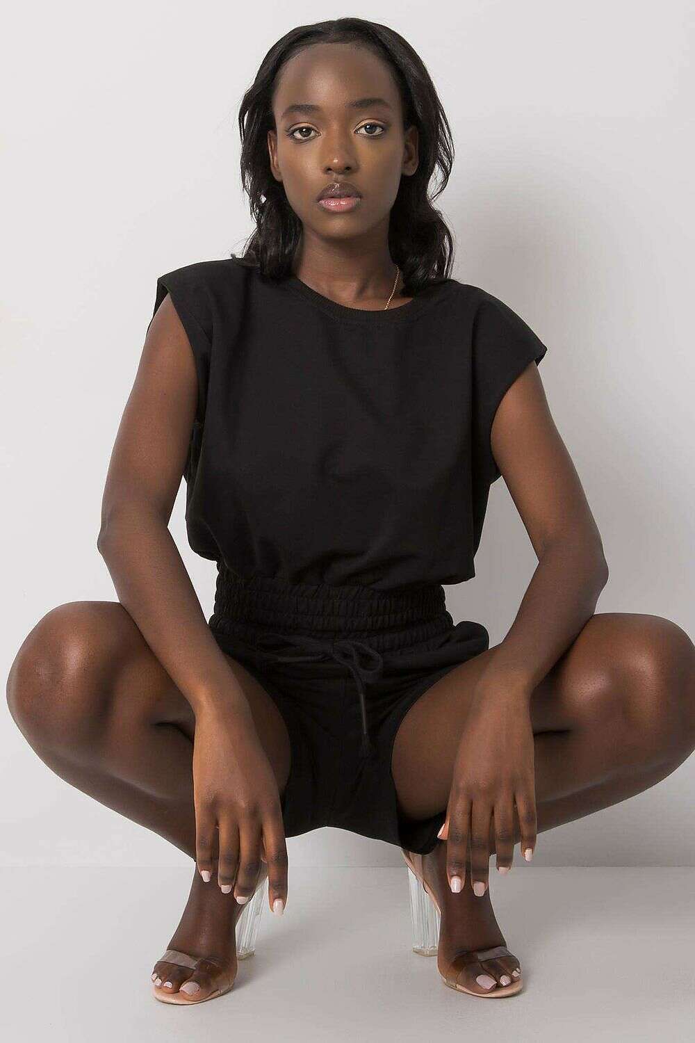 The women's set consisting of a sweatshirt and shorts is an ideal proposition for everyday wear and sporty stylizations. The smooth, uniform material gives the whole a minimalist, modern character. The short-cut sweatshirt with a round neckline and sewn-in shoulder pads subtly emphasizes the silhouette, adding structure to it. Sleeveless design ensures freedom of movement and comfort on warmer days. The shorts with a simple cut and medium (regular) waistline have side slip pockets and practical drawstrings in the waist for individual adjustment. The set made of a blend of cotton, polyester, and elastane combines the natural softness with the flexibility and durability of the material.