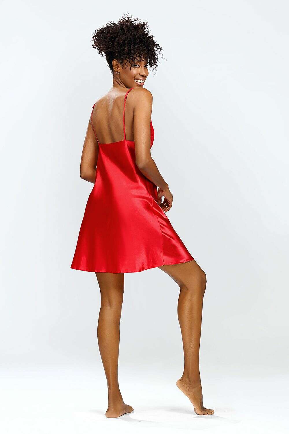 - Corset-style lace top and satin skirt create a flattering, feminine shape