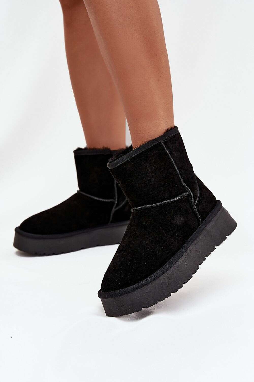 Women's snow boots made of natural suede. The interior lined with soft fur guarantees comfort and warmth even on cold days. Set on a platform made of rubber material effectively insulates from the cold ground, ensuring comfort during everyday use. This is the perfect choice for practical, fashionable, and comfortable winter outings.