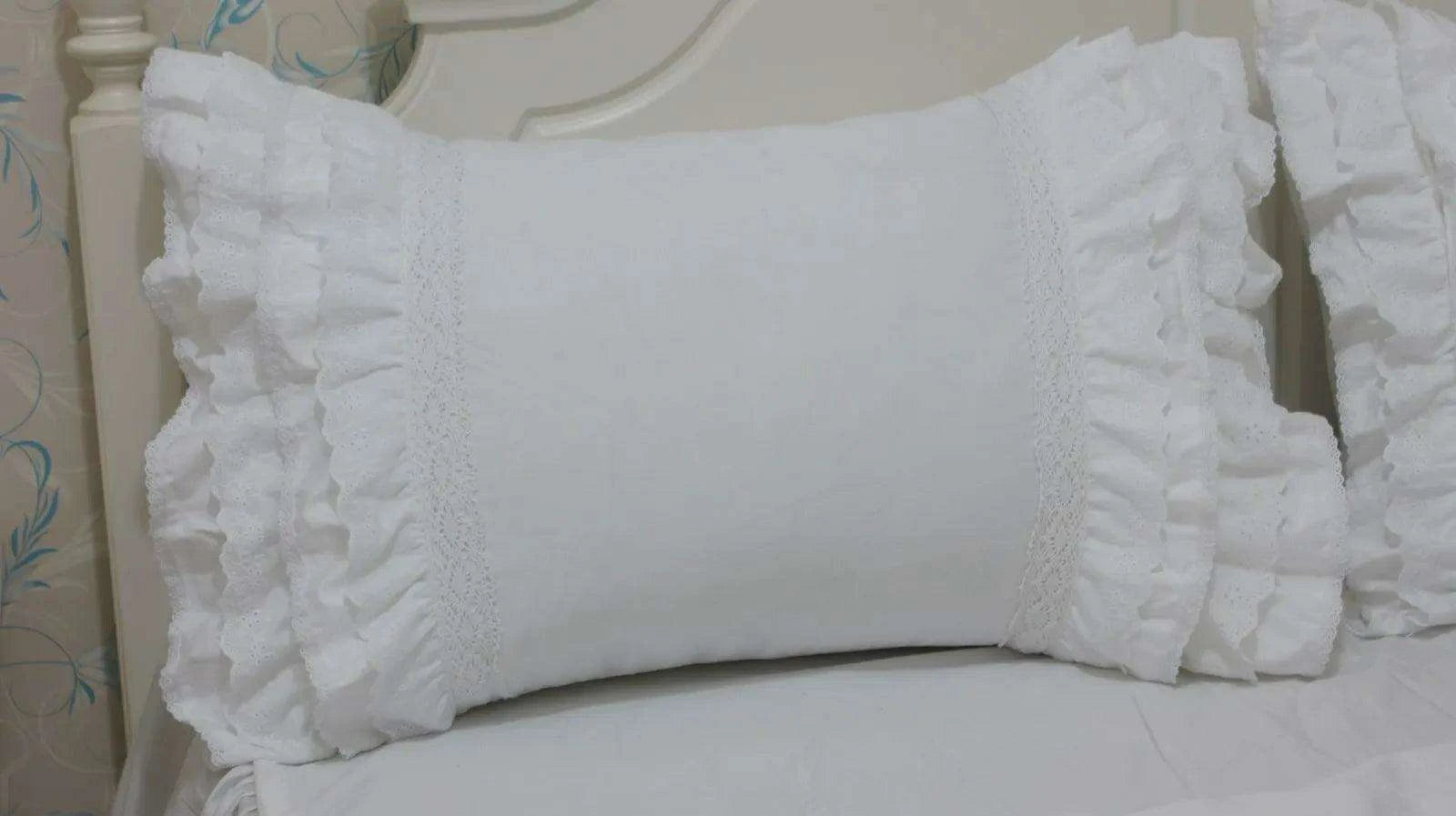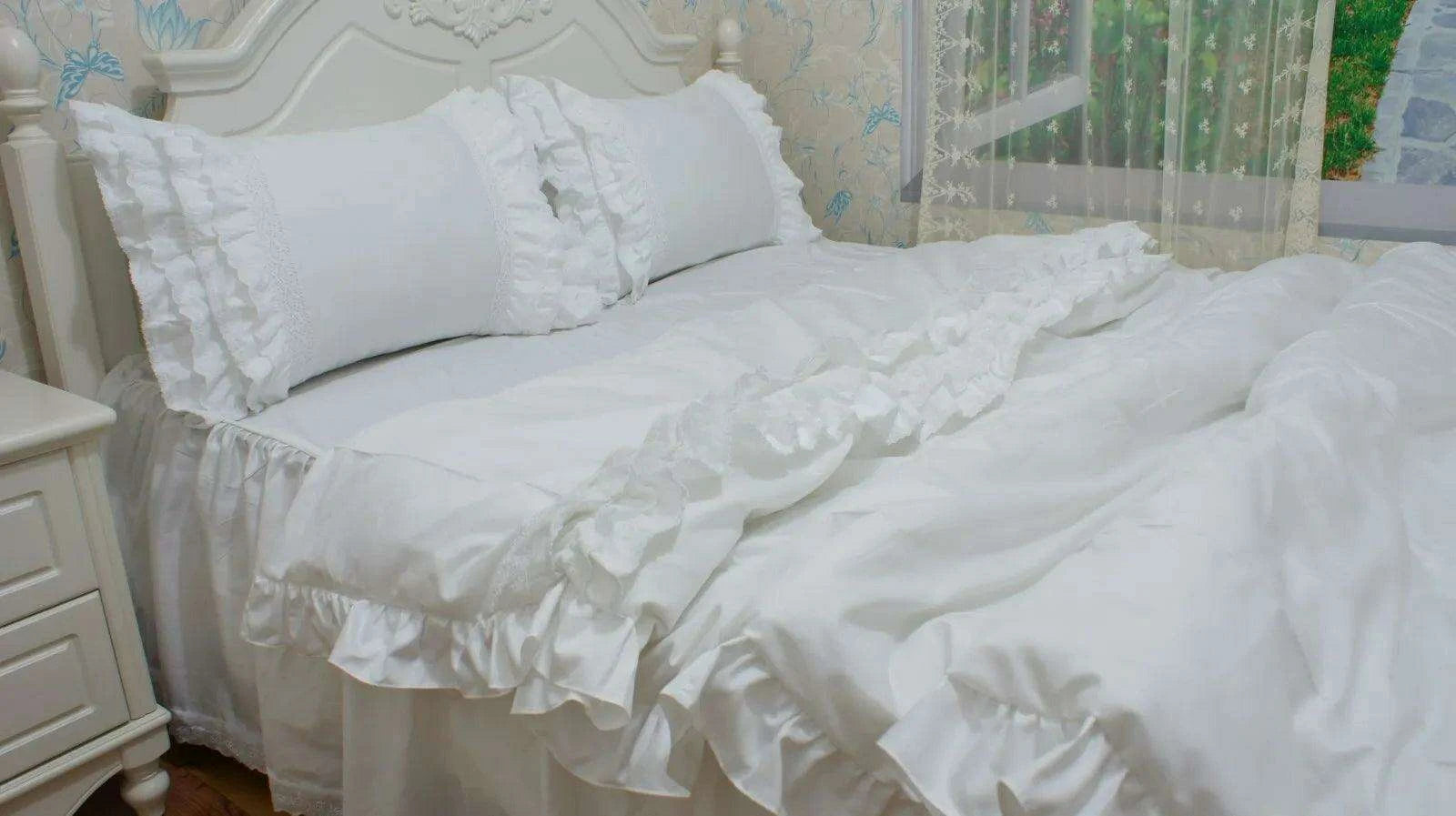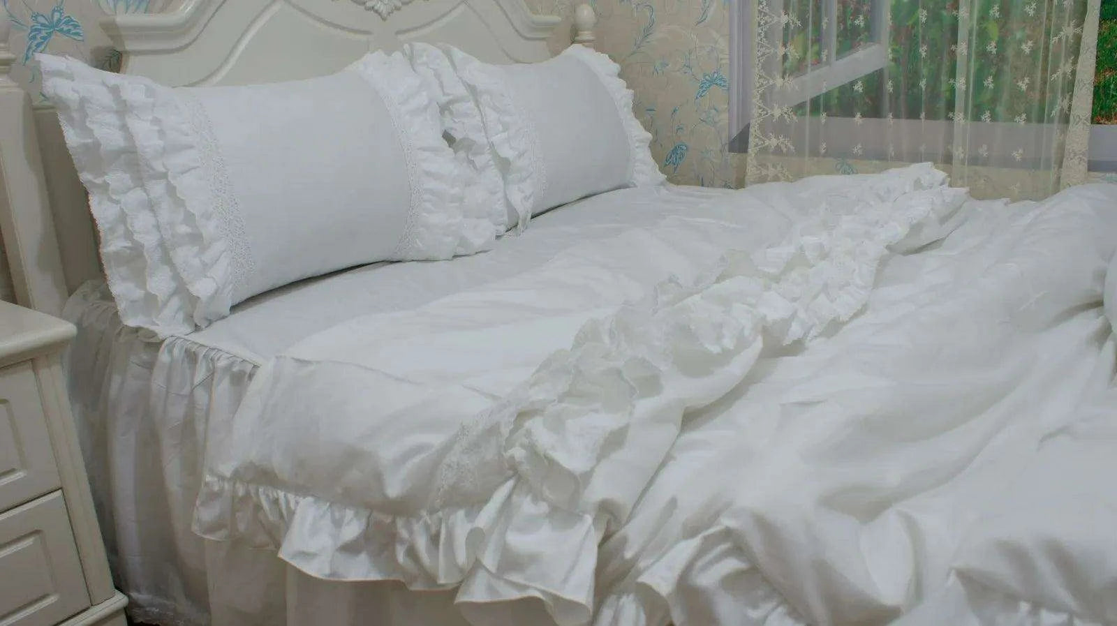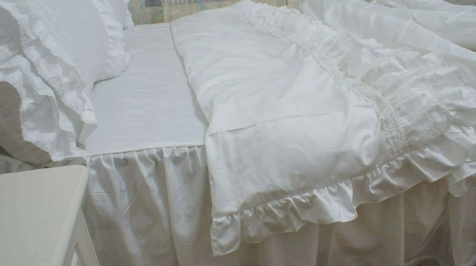 Elegant White Cotton Bedding Ensemble with Lace Accents and Embroidered Frills