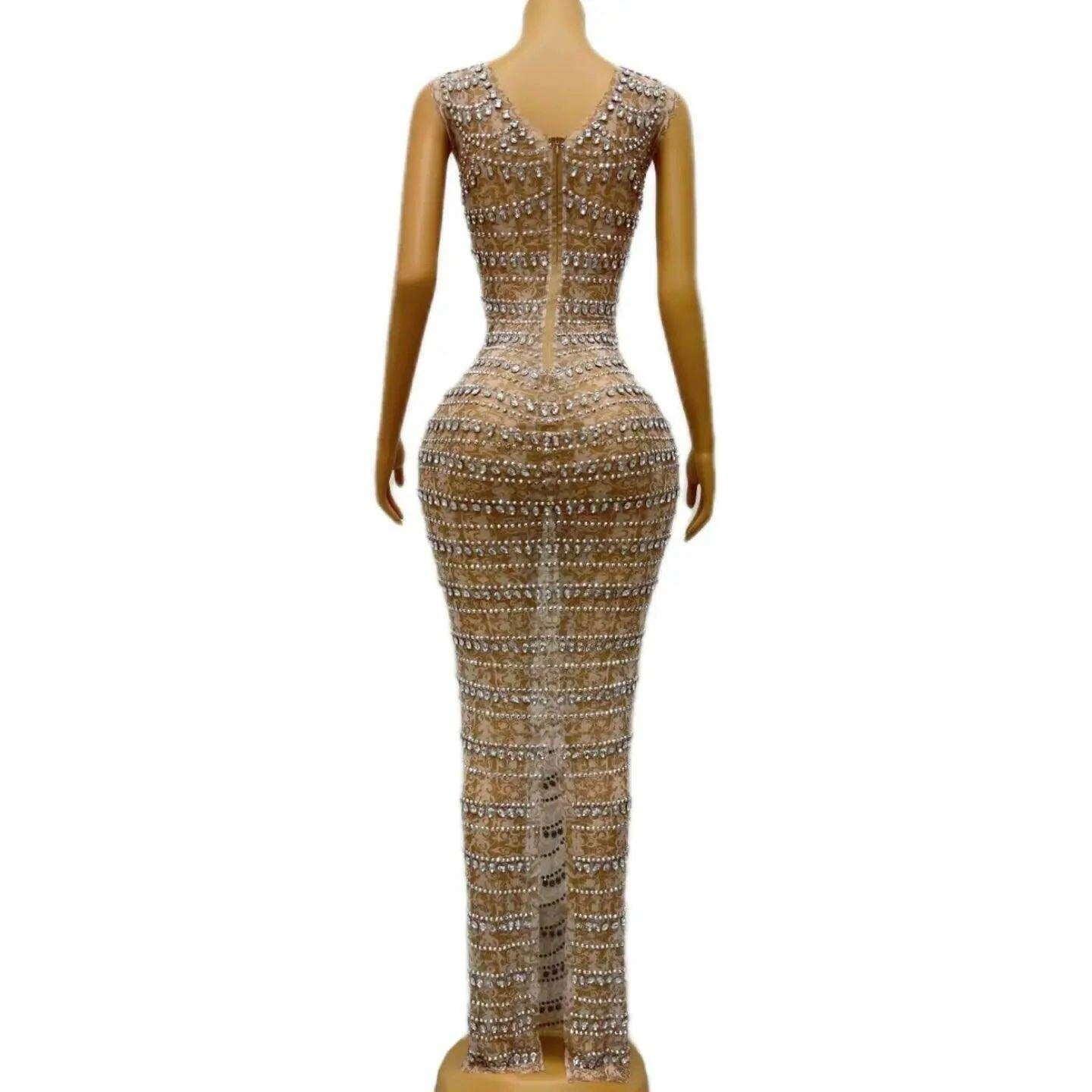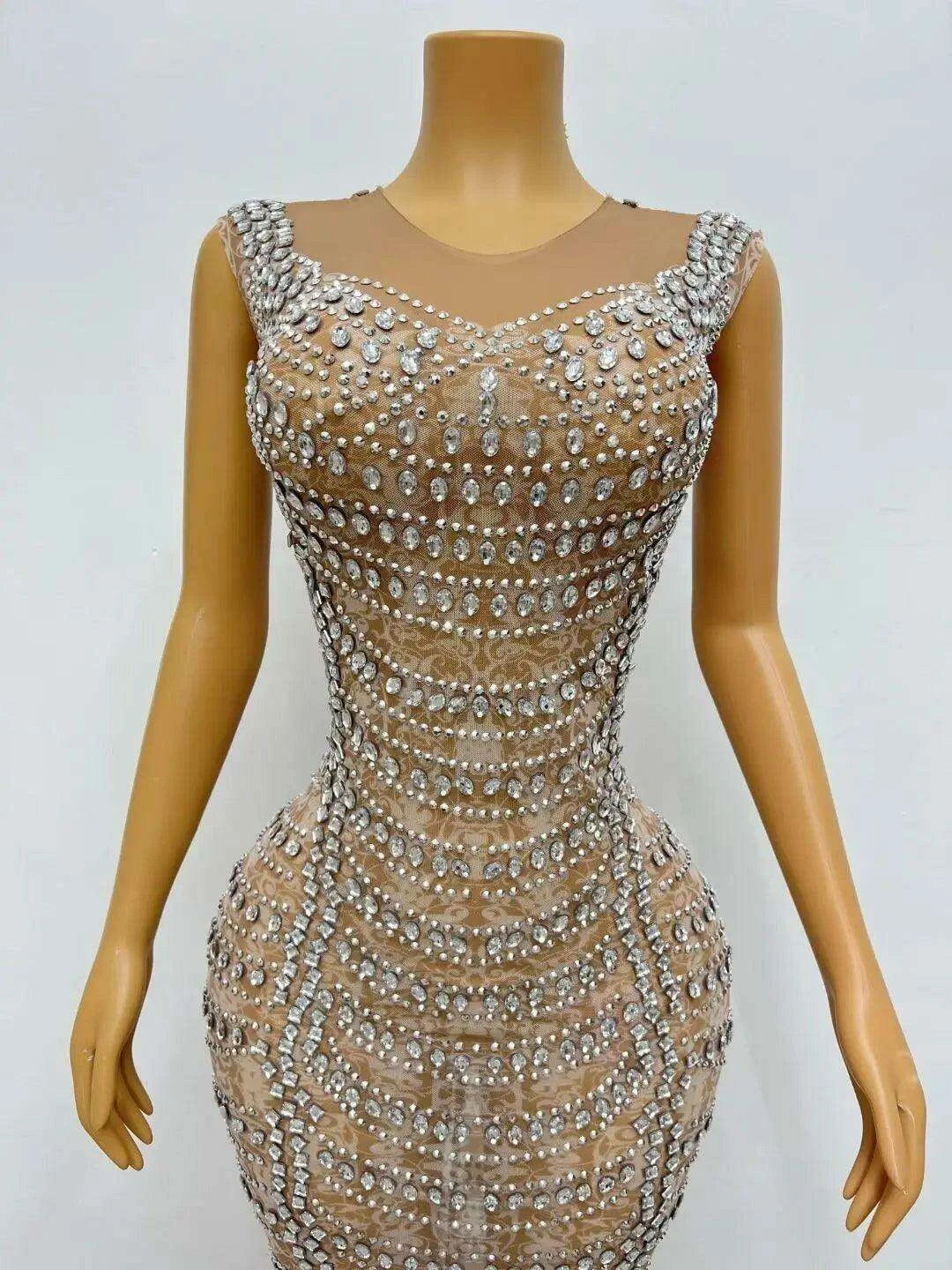 Glittering Crystal-Embellished Mesh Dress for Nightclub Performers