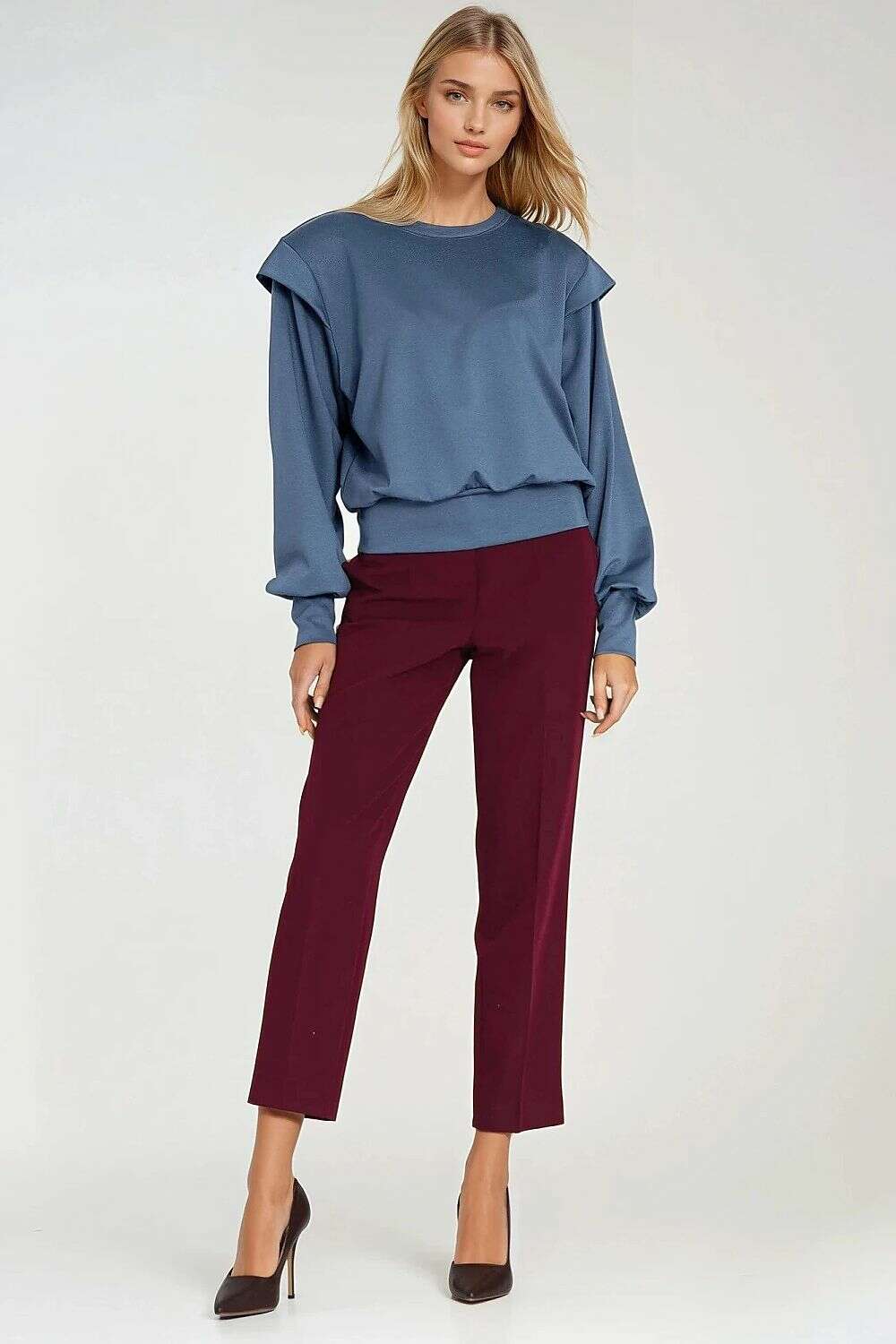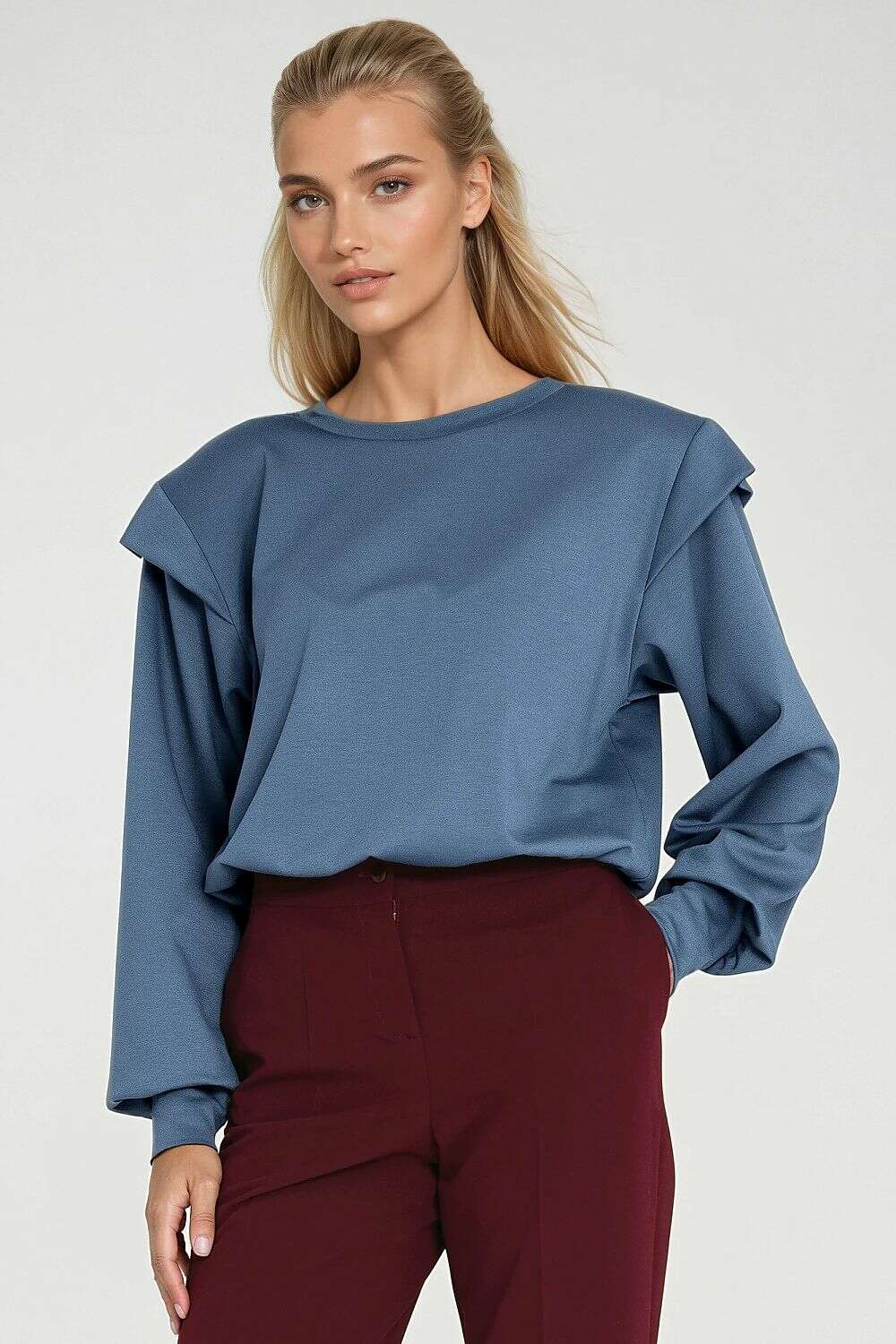 Meet the Womens Oversized Sweatshirt Round Neckline Shoulder Pads—a chic fusion of comfort and contemporary design. The oversized silhouette features a classic round neckline, long sleeves with a dropped shoulder line, and wide ribbing that adds bold character. Subtle shoulder pads shape the silhouette, delivering a touch of elegance to a casual staple. Slip on over the head for easy wear, with a high ribbed hem that keeps the fit secure and flattering through every movement. This versatile sweatshirt transitions beautifully from everyday styling to more polished ensembles.
