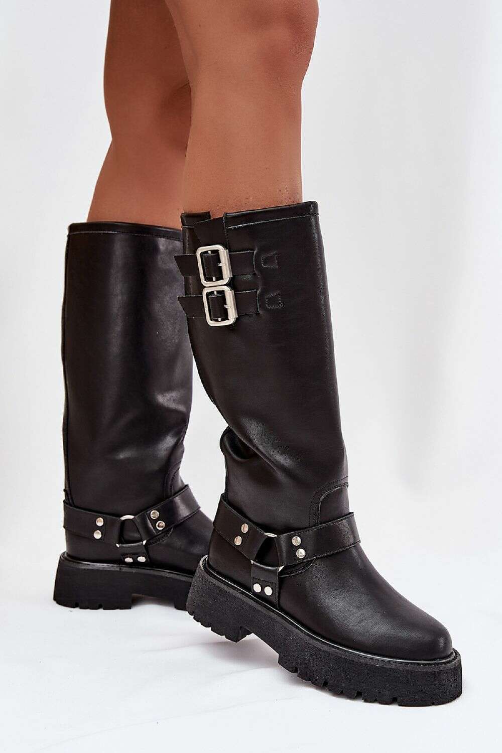 - Slip-on design with decorative buckles and metal rings for edgy appeal