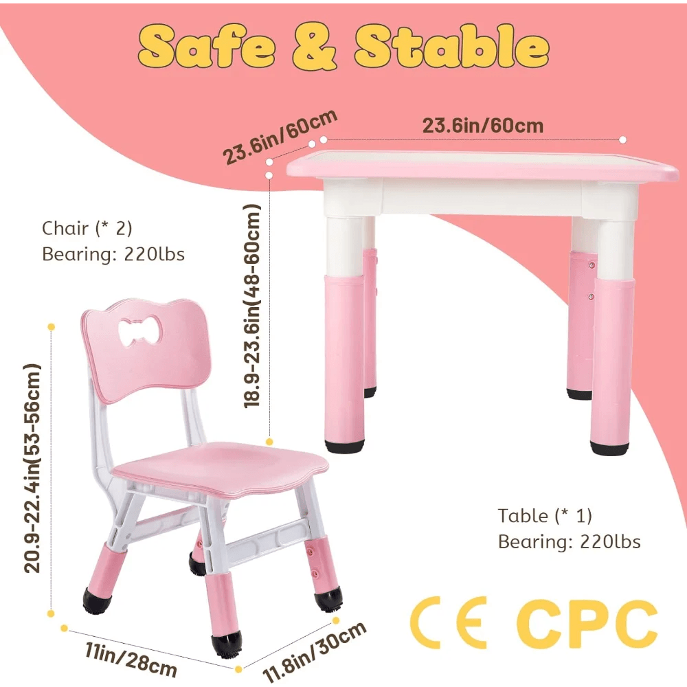 - Height Adjustable: The table height ranges from 18.9 to 23.6 inches (48-60 cm), while the chairs come in three different heights, accommodating your growing child.