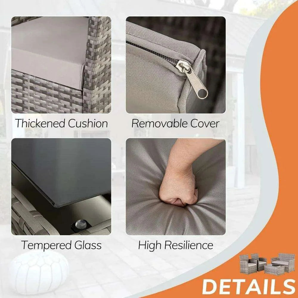 • Versatile Combination: This set includes 2 single chairs, 1 loveseat, and 1 elegant table with a tempered glass top, allowing you to customize your seating arrangement.