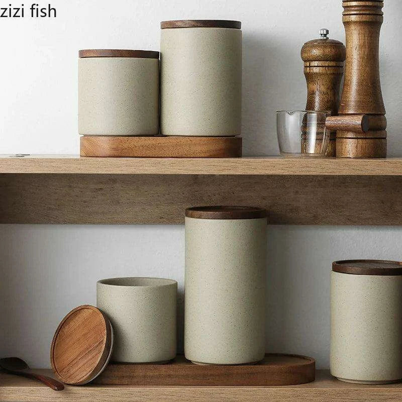 Vintage-Inspired Ceramic Canister Set with Airtight Wooden Lids for Tea and Coffee Storage