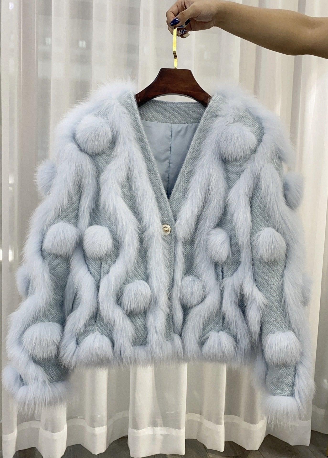 Step into a realm of sophistication and warmth with the Arctic Frost Fox Fur Knit Cardigan. This luxurious outerwear piece is perfect for those who cherish the finer things in life and desire to stand out during the colder months.