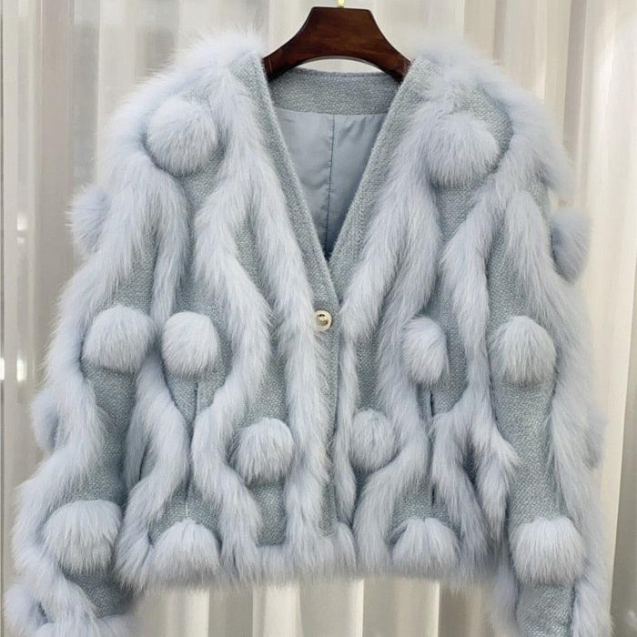 Step into a realm of sophistication and warmth with the Arctic Frost Fox Fur Knit Cardigan. This luxurious outerwear piece is perfect for those who cherish the finer things in life and desire to stand out during the colder months.