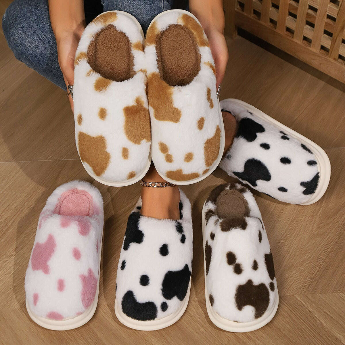 Cute Cow Spotted Plush Slippers - Winter Warm Non-slip Bedroom Floor Fuzzy Slipper for Couples