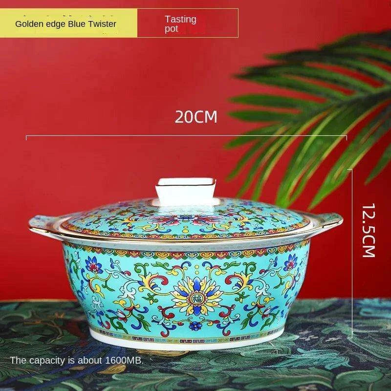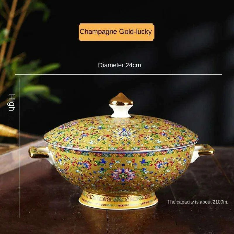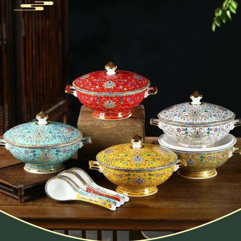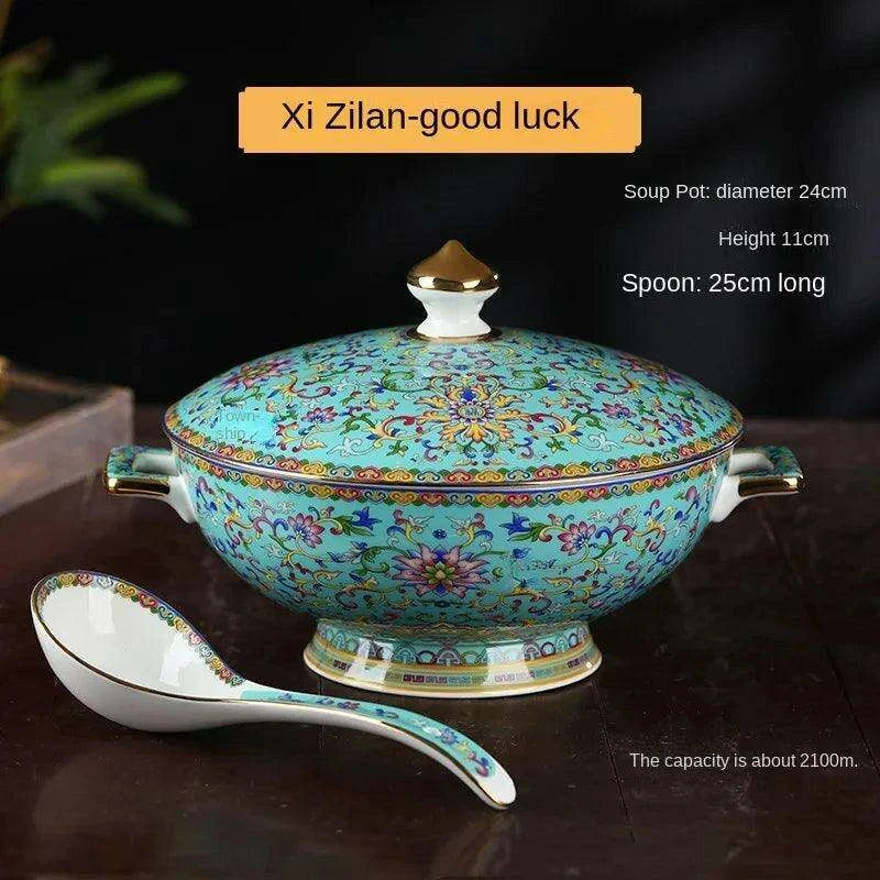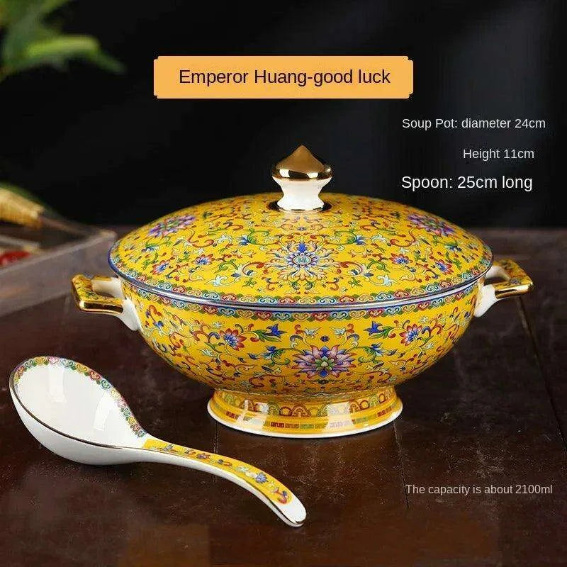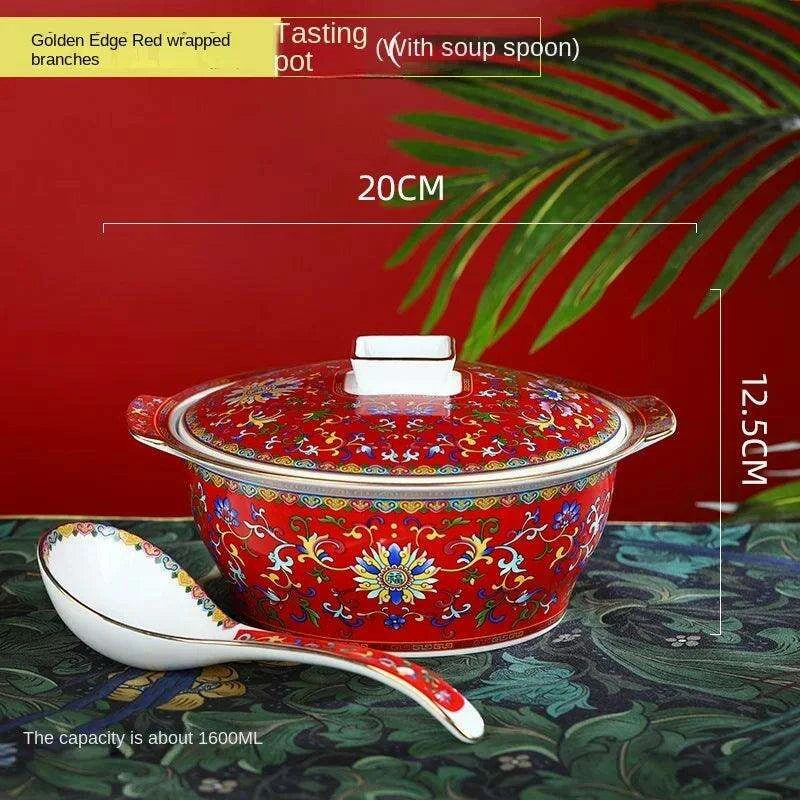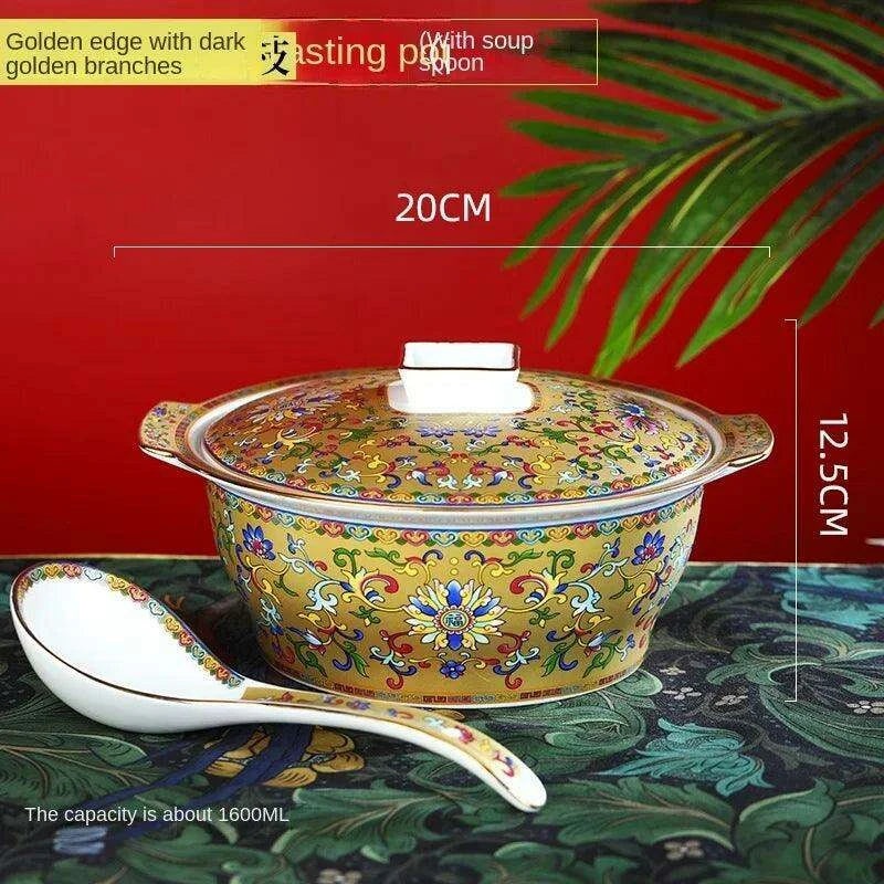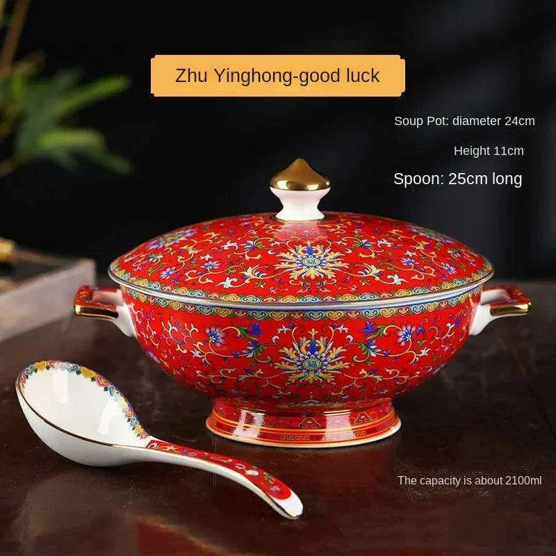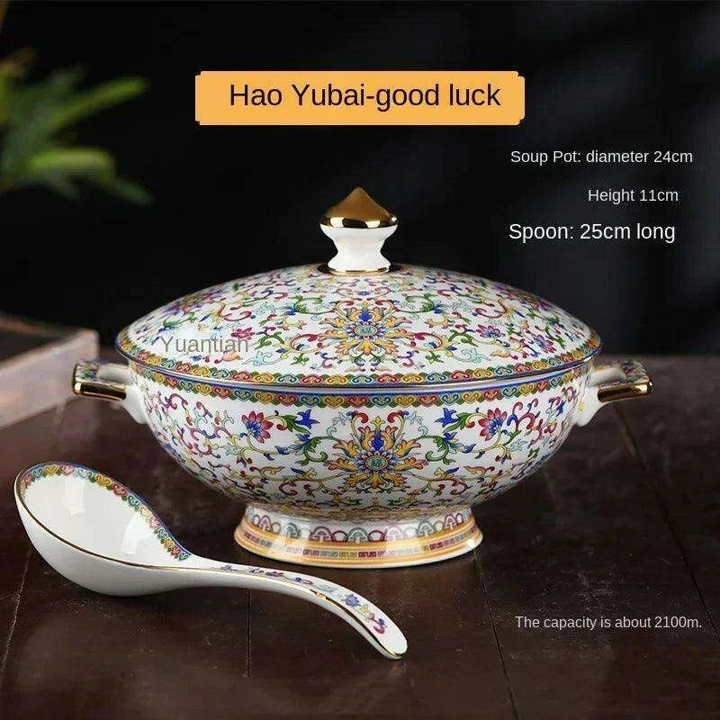 Authentic Elegant Under-glazed Ceramic Soup Pot with Lid and Spoon - Large Round Design with Gold Accents for Chinese Dining and Decor