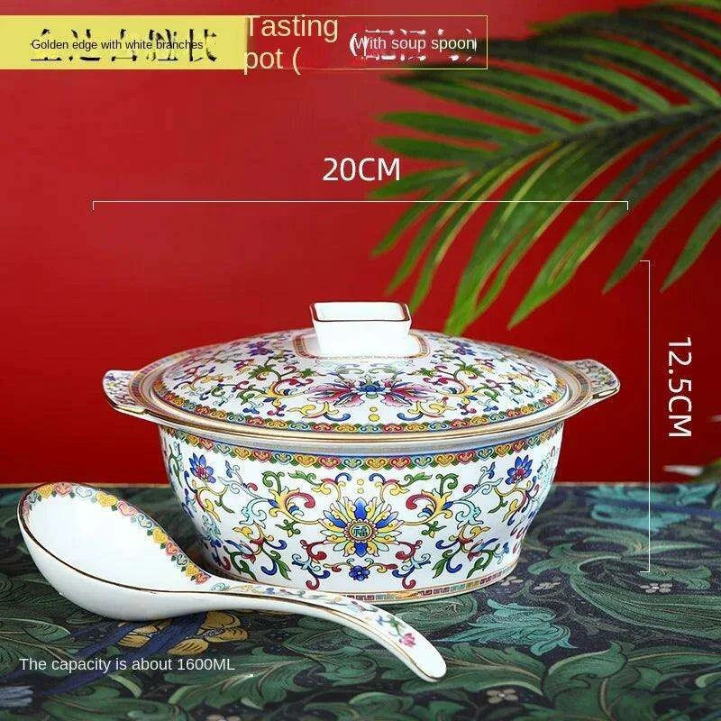 Sophisticated Ceramic Soup Pot Set with Lid and Spoon - Large Round Bone Pattern with Gold Trim for Chinese Dining and Decor