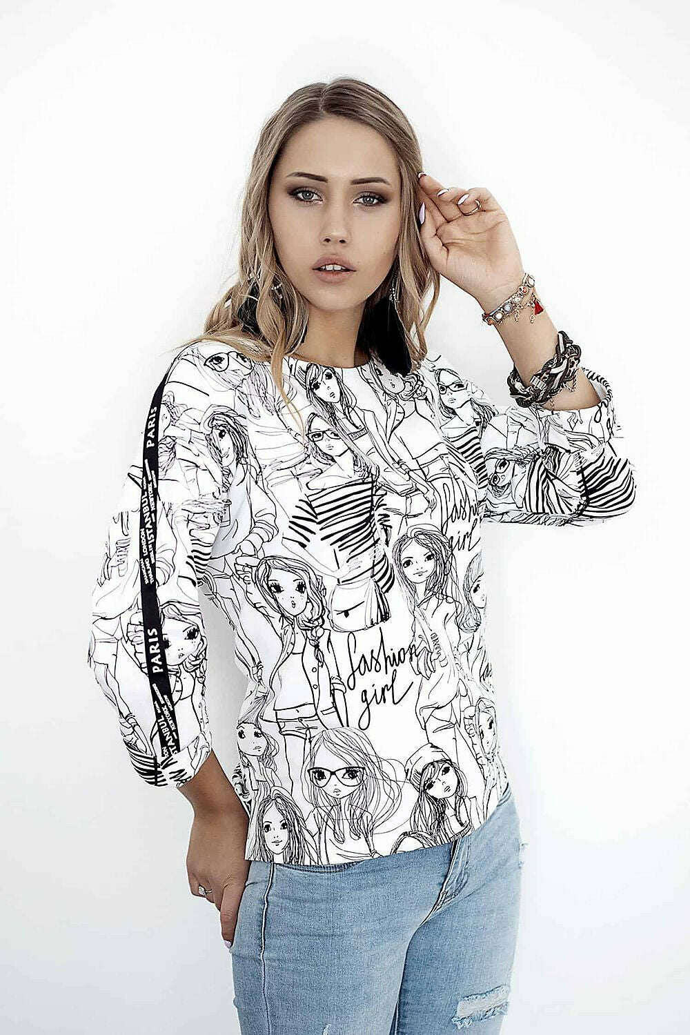 Blouse with a loose cut, 3/4 sleeves, decorative tape with the inscription on the sleeves. Perfect for casual meetings and more. Back lengthened.