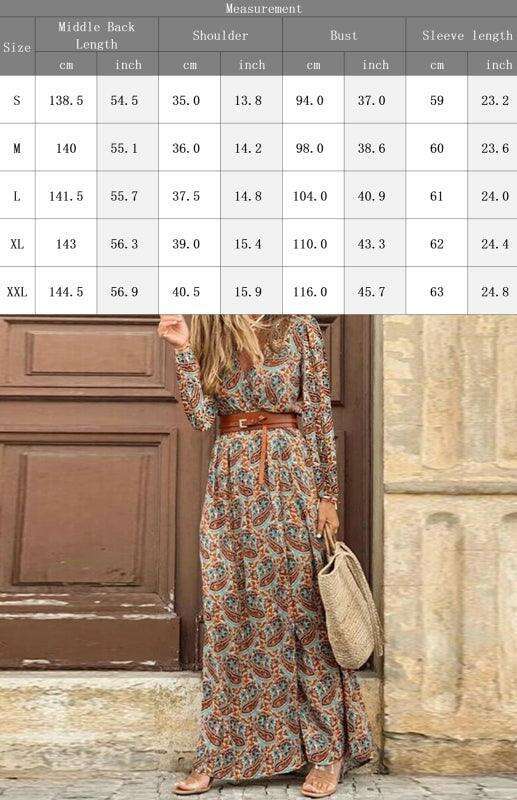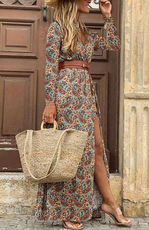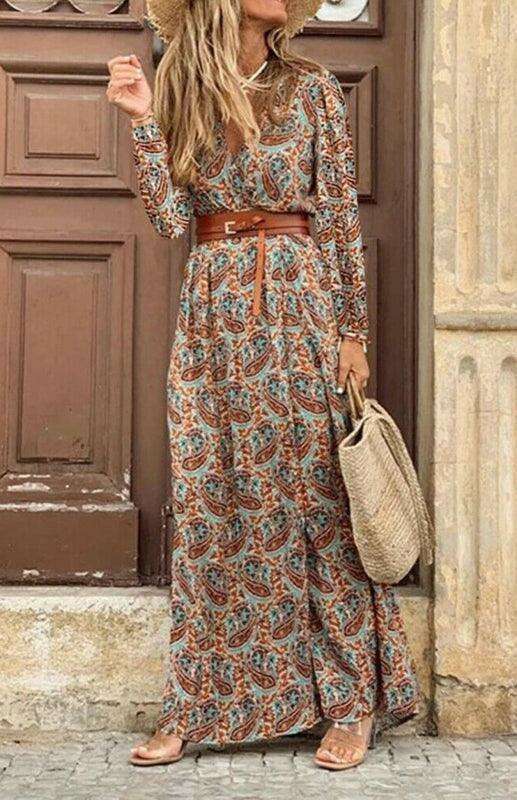 Bohemian Floral V-Neck Maxi Dress with Adjustable Belt - Très Elite