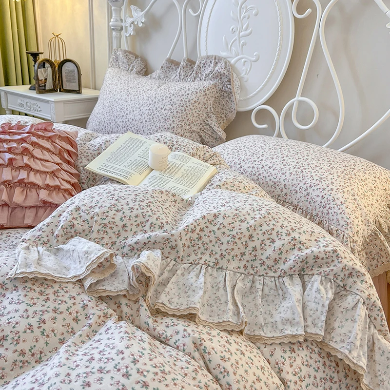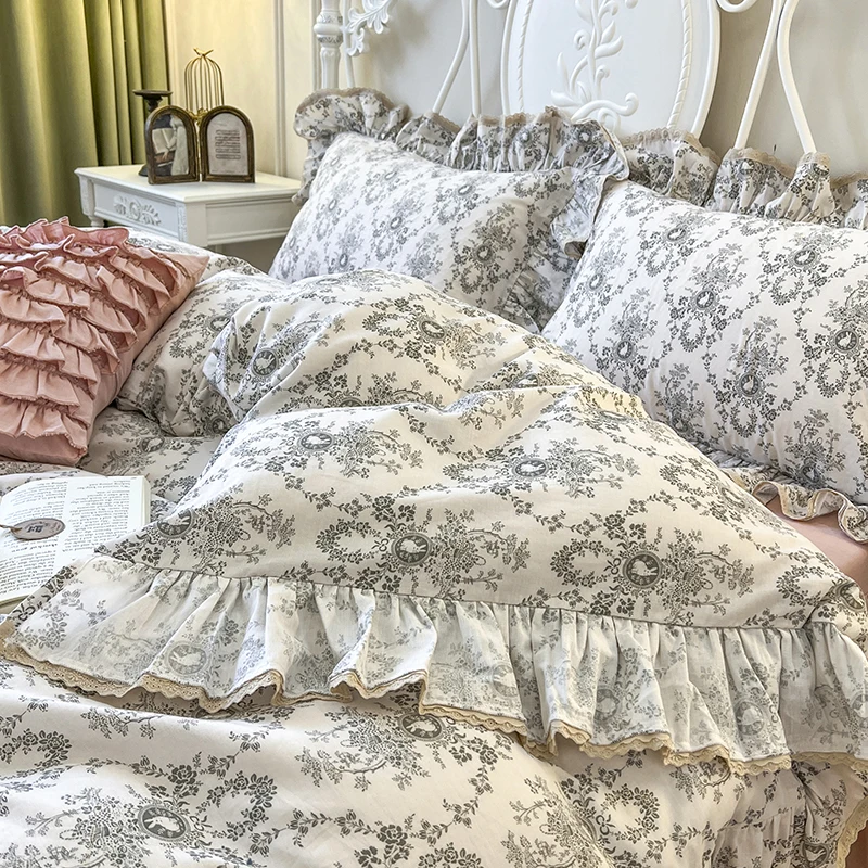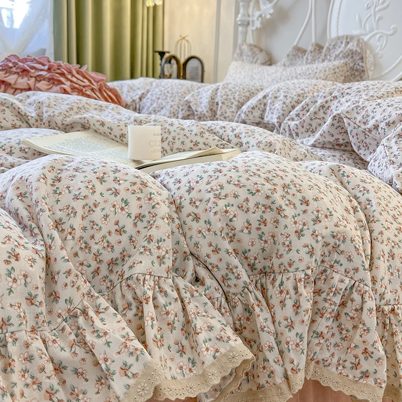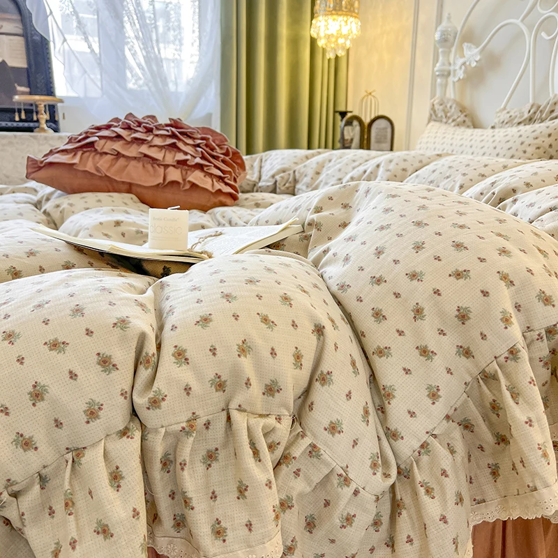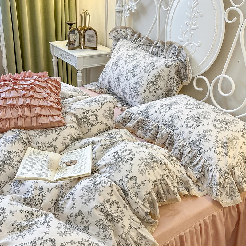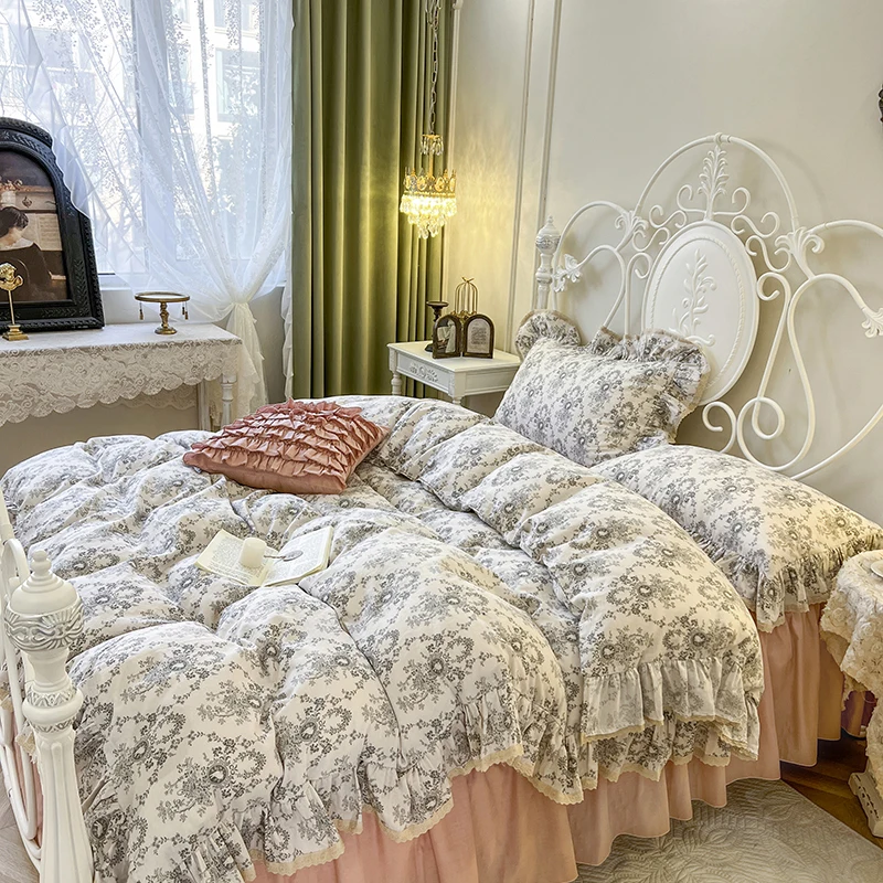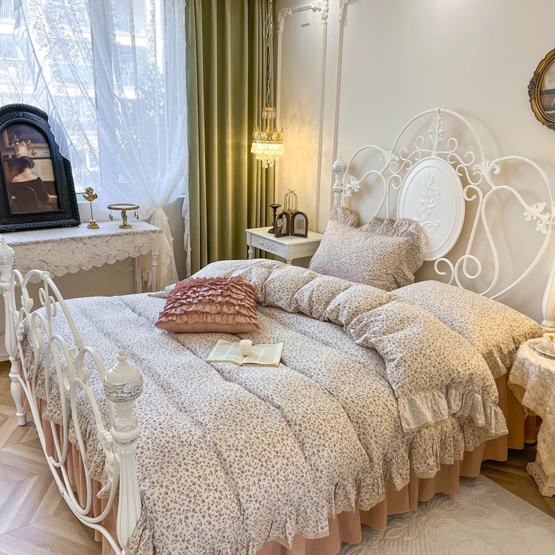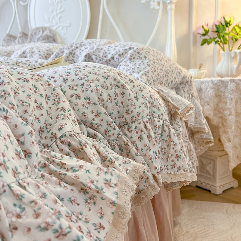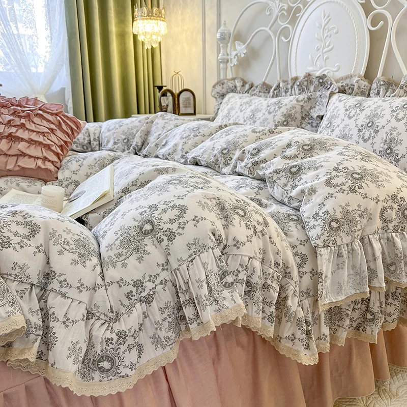 Charming Vintage Floral Lace Cotton Bedding Set with Ruffled Skirt and Matching Pillowcases