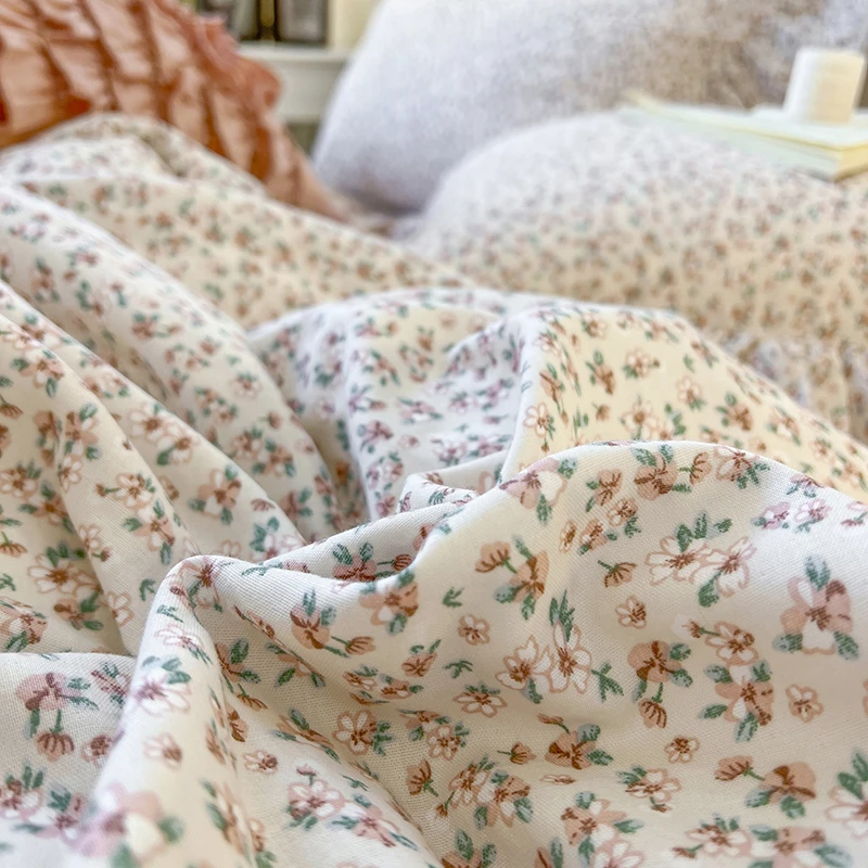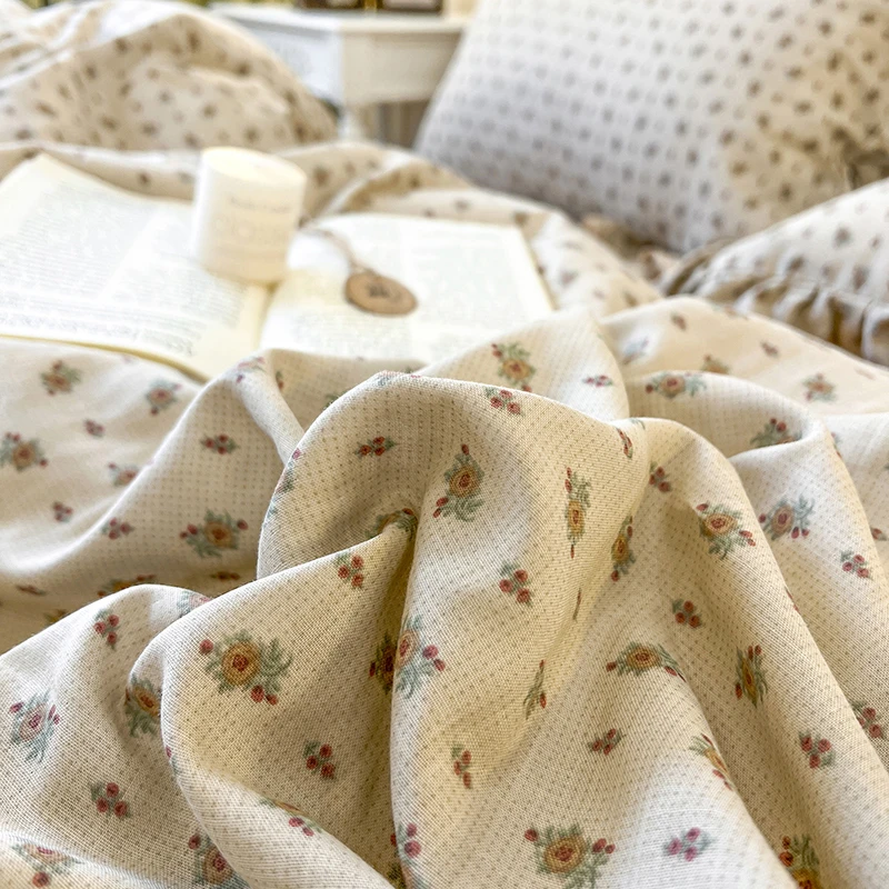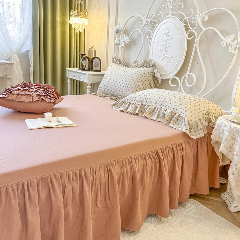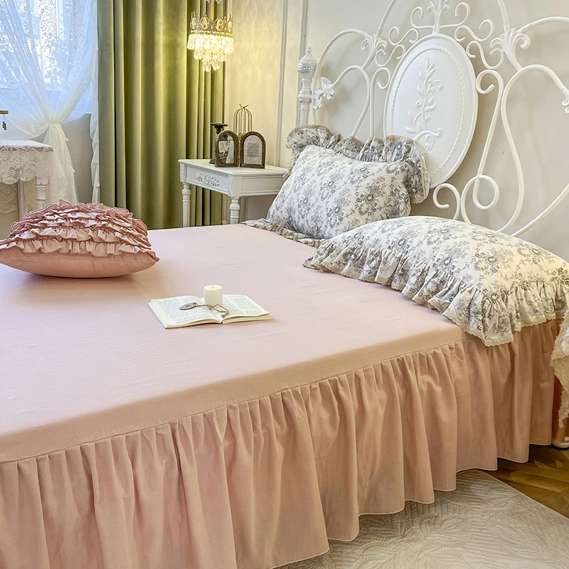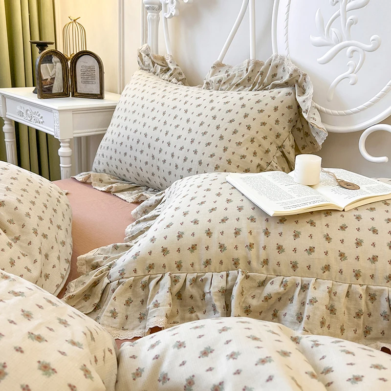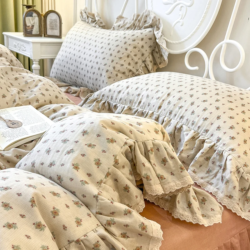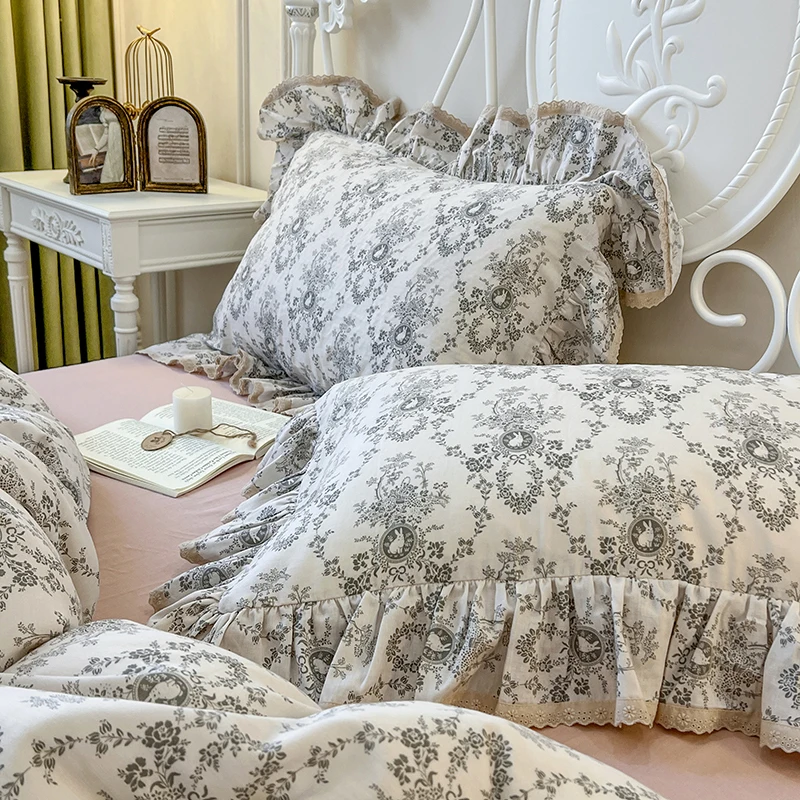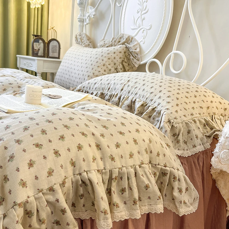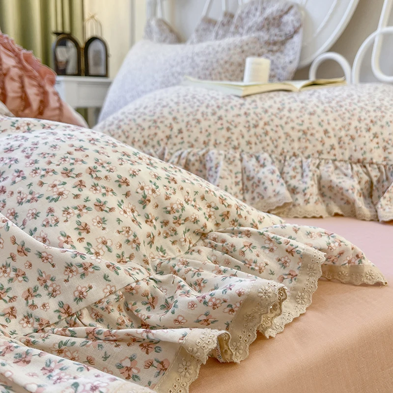 Charming Vintage Floral Lace Cotton Bedding Set with Ruffled Skirt and Matching Pillowcases