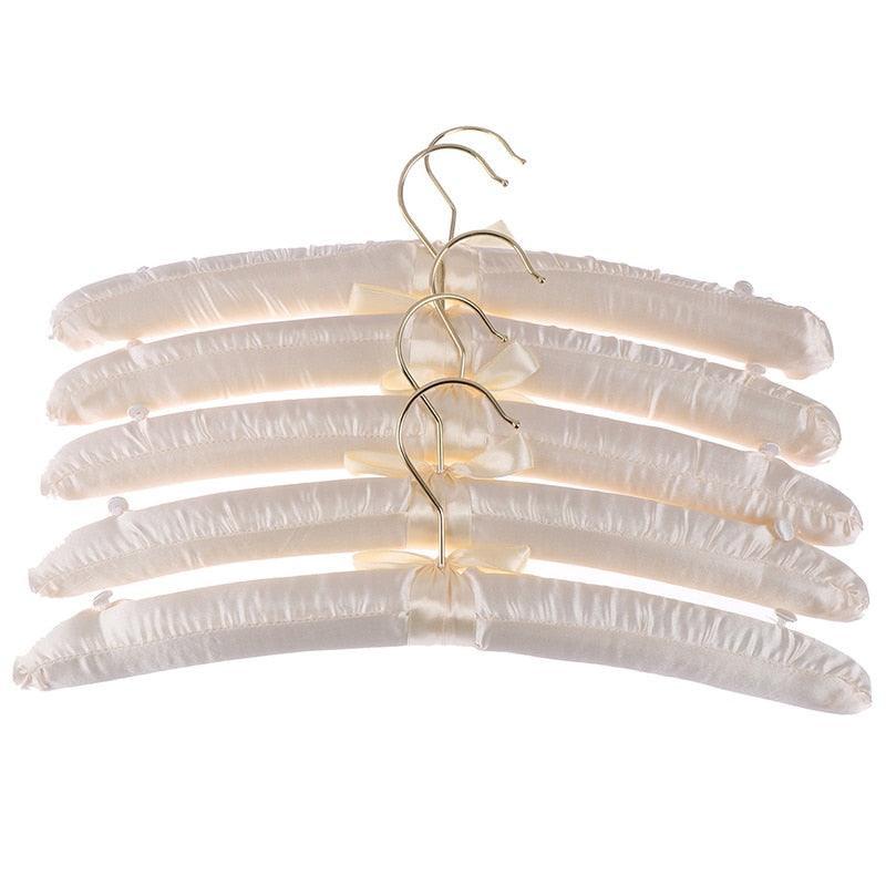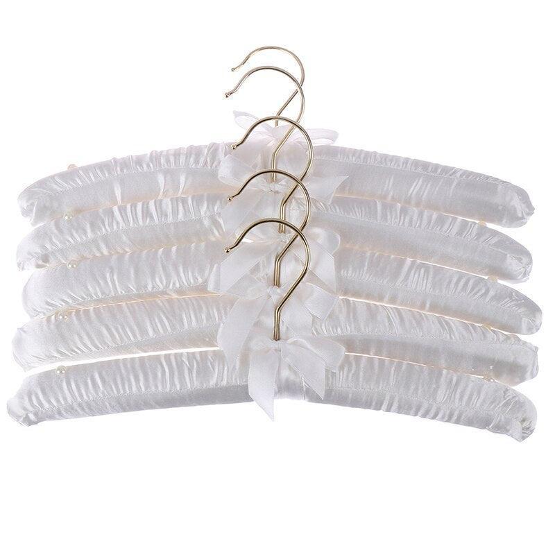 Upgrade your closet with our luxurious set of 5 beige and white satin padded hangers, designed specifically for premium garment care and elegance. Perfectly crafted to accommodate delicate adult clothing, bridal attire, lingerie, and other cherished pieces, these hangers ensure your items remain in impeccable condition.