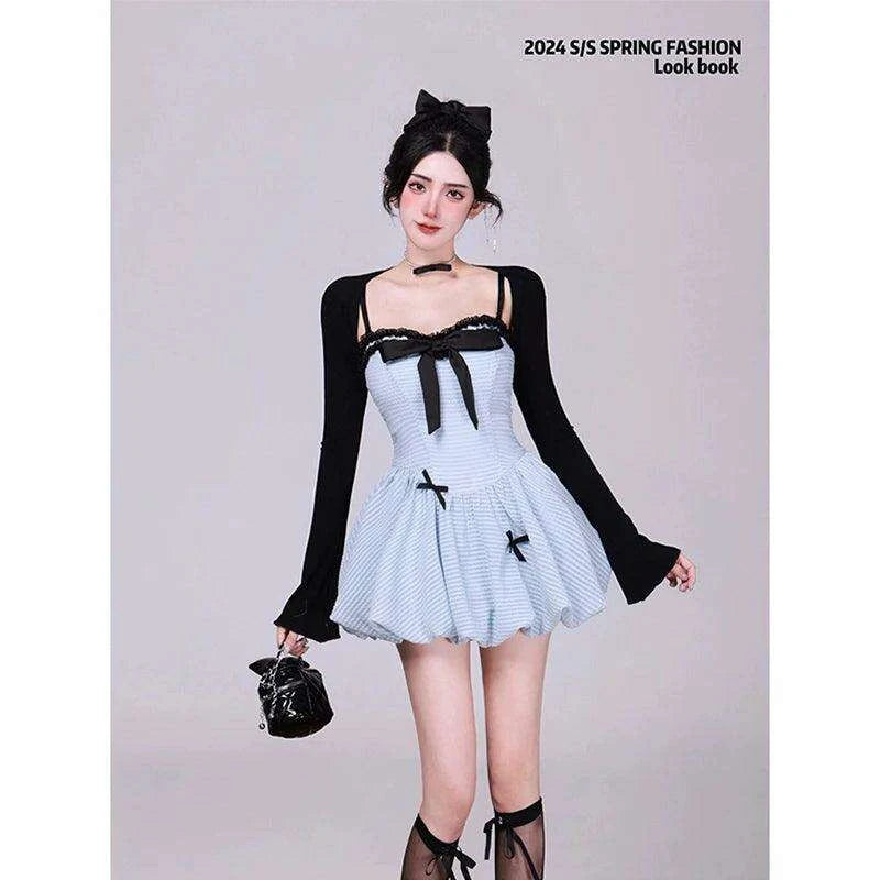 Chic Black Ensemble: Long Sleeve Cardigan & Bow-Detail Mini Dress - Y2K Korean Fashion for Summer 2024