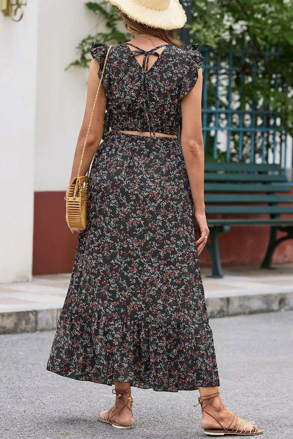 Step into a realm of sophistication with our Floral Elegance Ruffled Two-Piece Outfit. This exquisite ensemble is perfect for the discerning fashionista who loves to blend chic style with effortless charm. Featuring a beautifully crafted Floral Frill Tie-Back Top complemented by a flowing Maxi Skirt, this outfit is ideal for any occasion where you wish to make a striking impression.