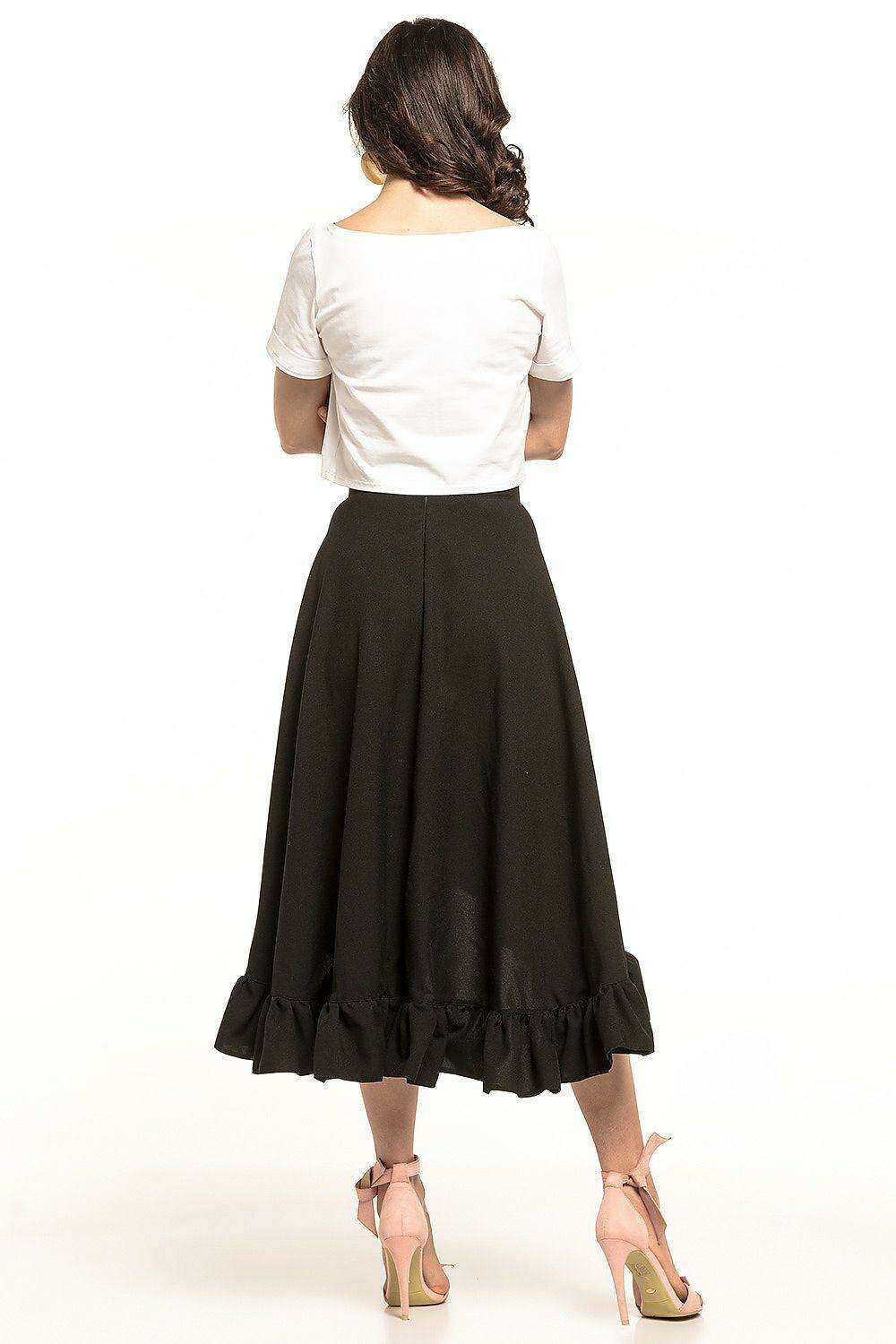 Adorned with a delightful frill at the bottom, this skirt adds a playful element to your outfit while maintaining a sophisticated appearance. Perfect for both casual outings and formal events, the Chic Frilled High-Low Midi Skirt is your go-to choice for versatility and flair.