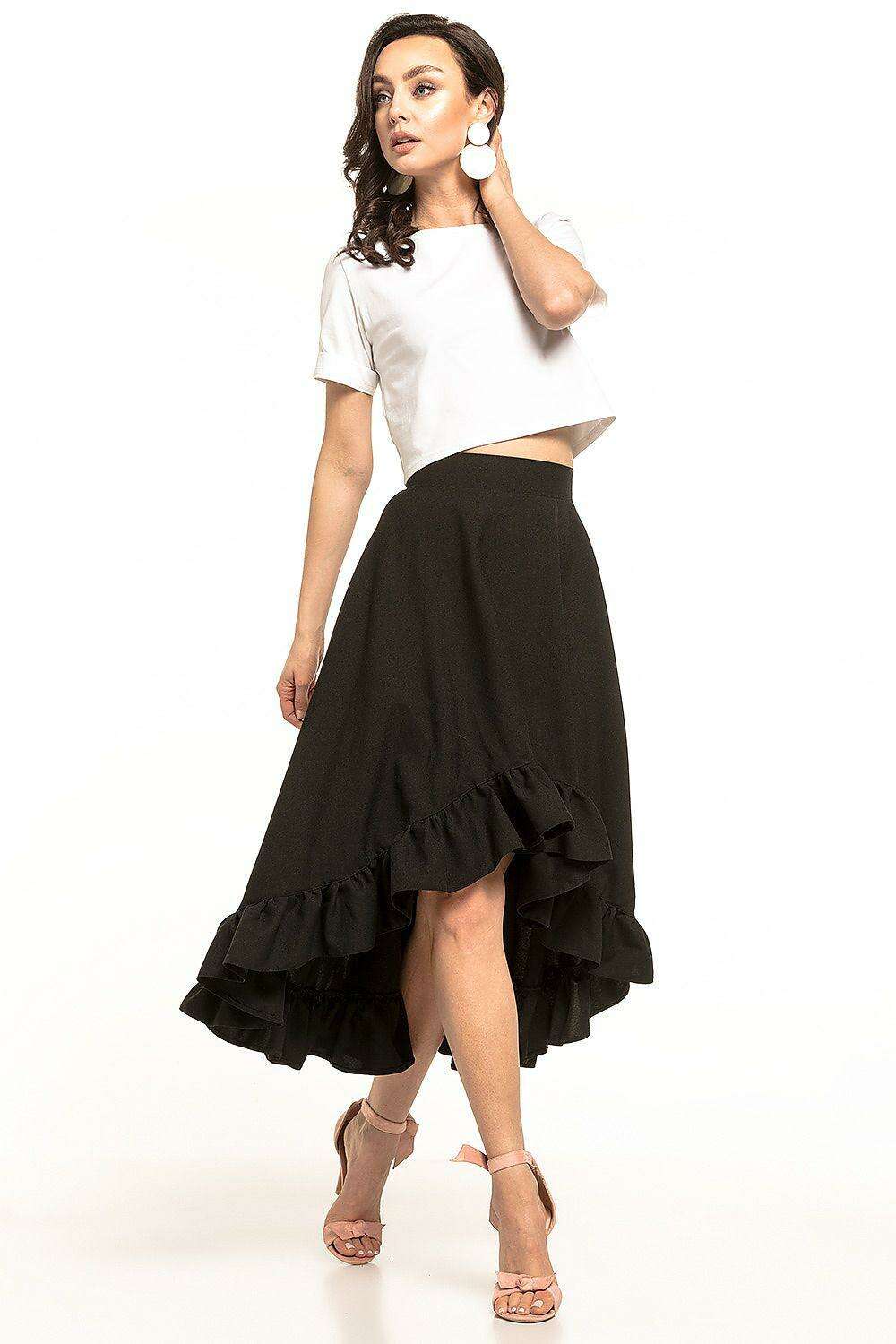 Introducing the Chic Frilled High-Low Midi Skirt, a fashion-forward piece that transcends ordinary style and brings a touch of elegance to any wardrobe. This stunning asymmetrical midi skirt is designed with a longer back, creating a unique silhouette that is sure to turn heads.