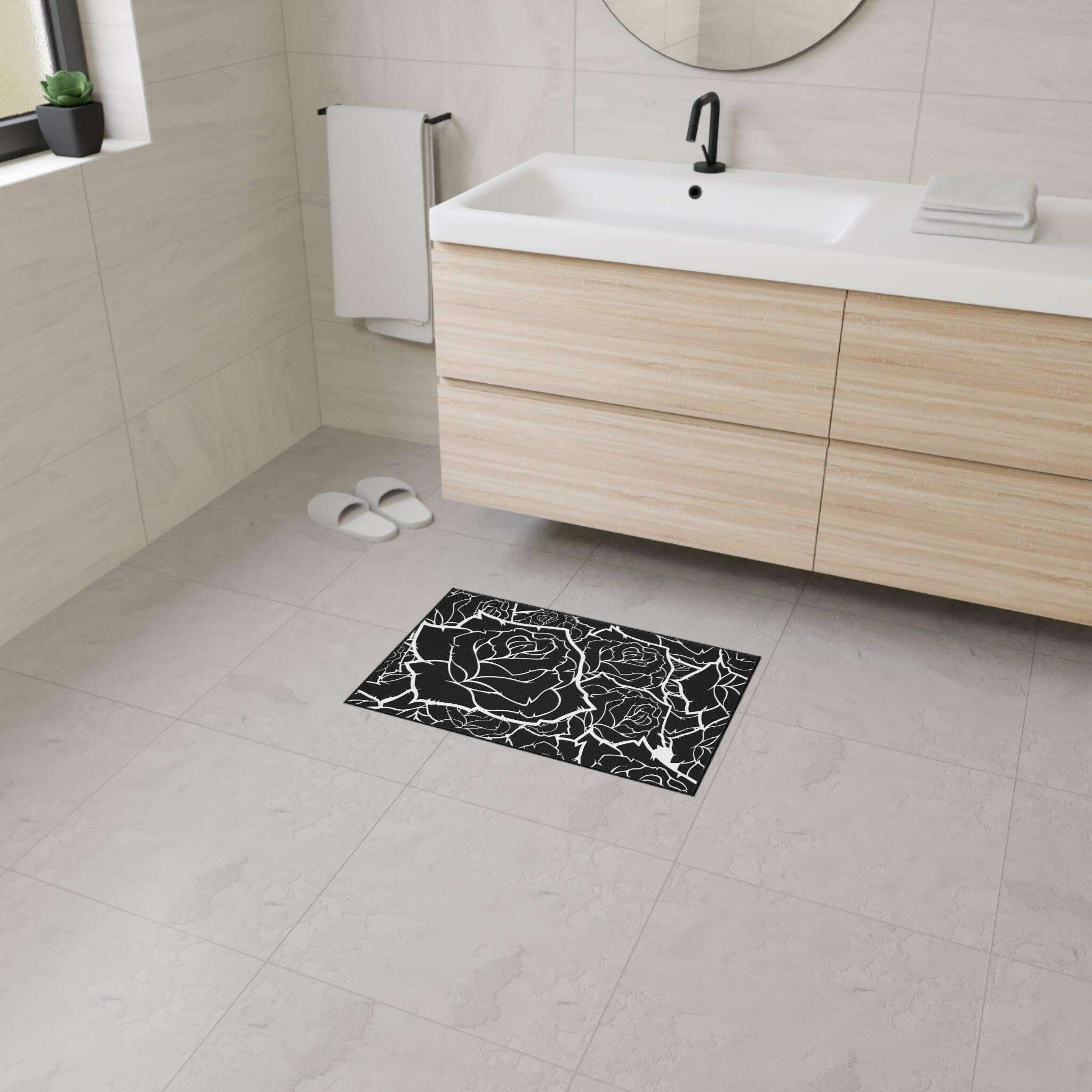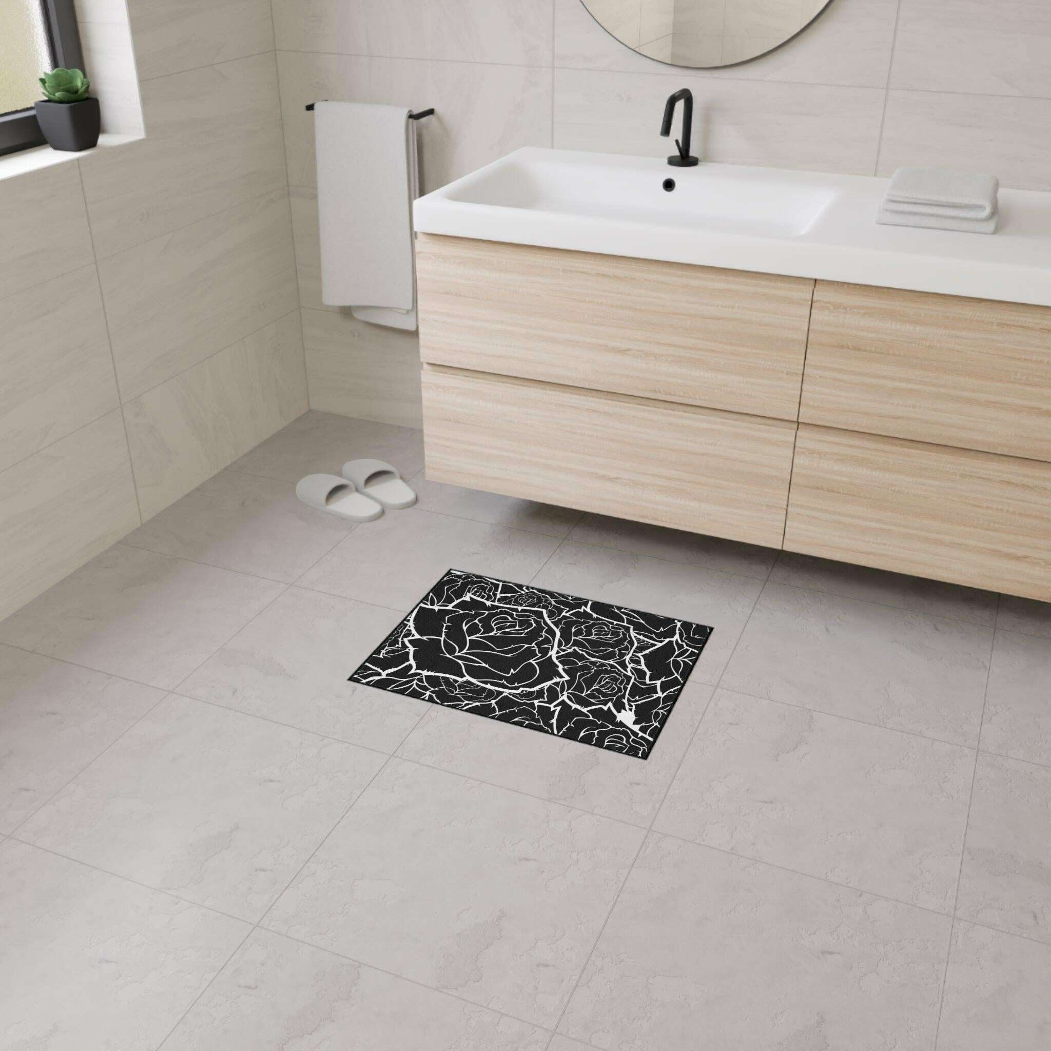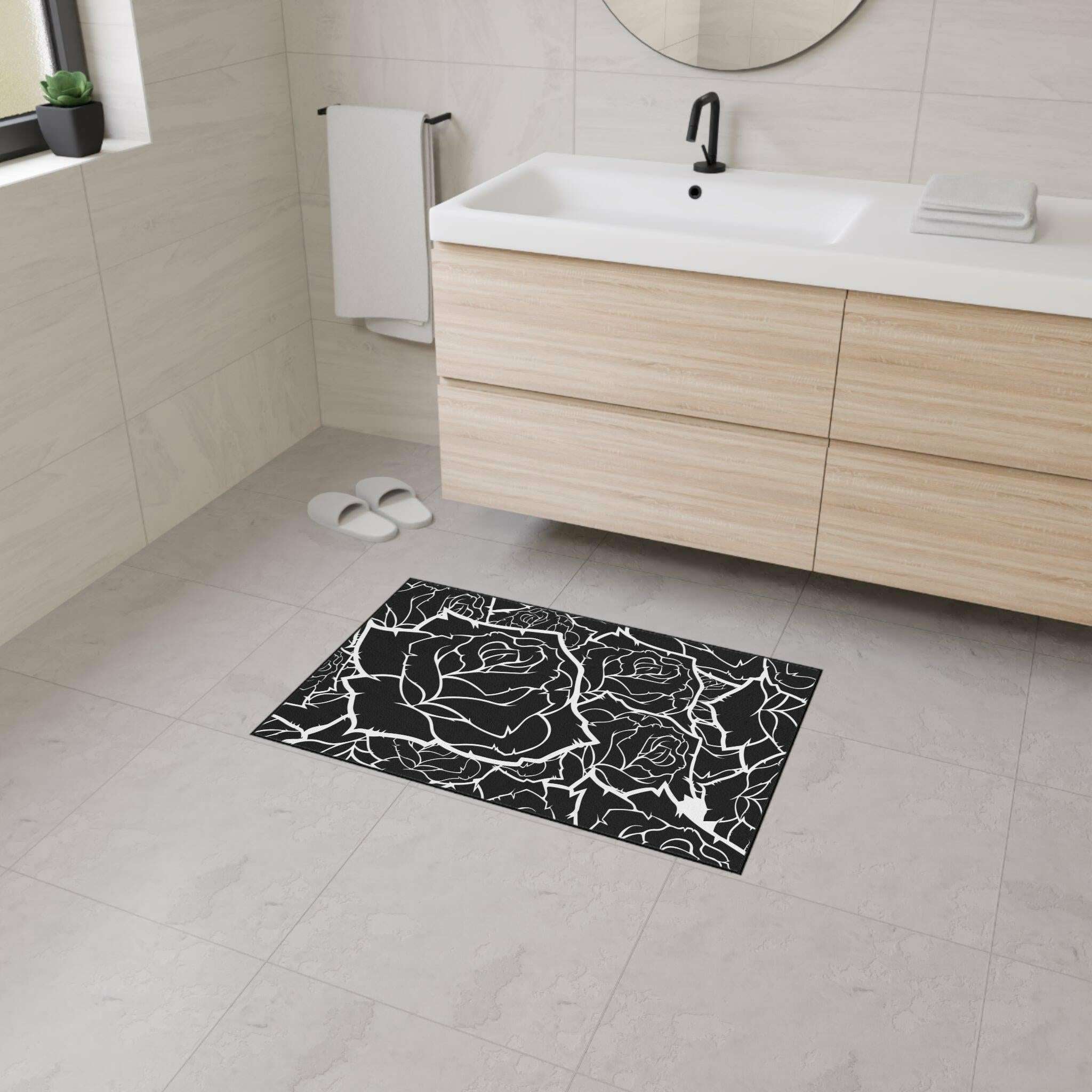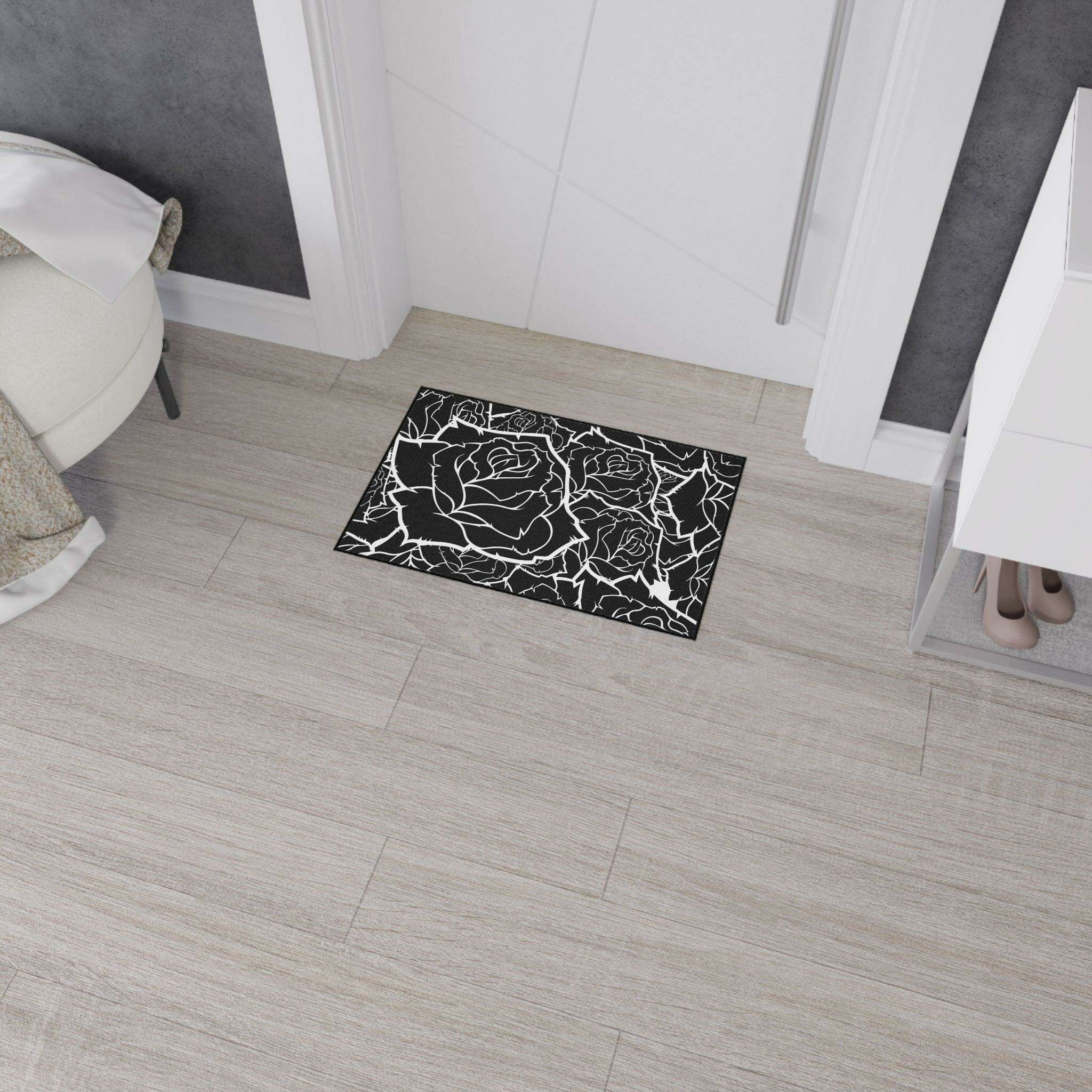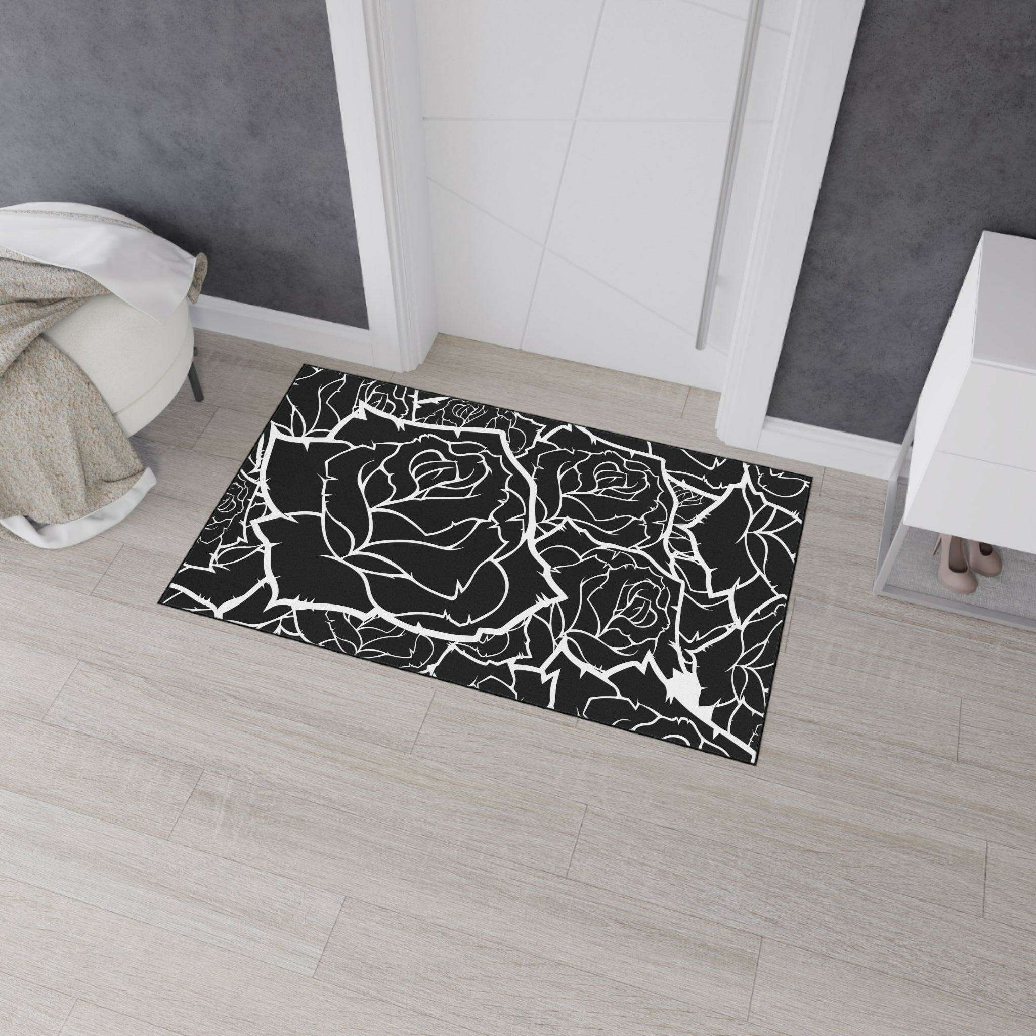 • Durable 100% polyester construction: This heavy-duty mat features a breathtaking black and white rose design, bringing elegance to any room.