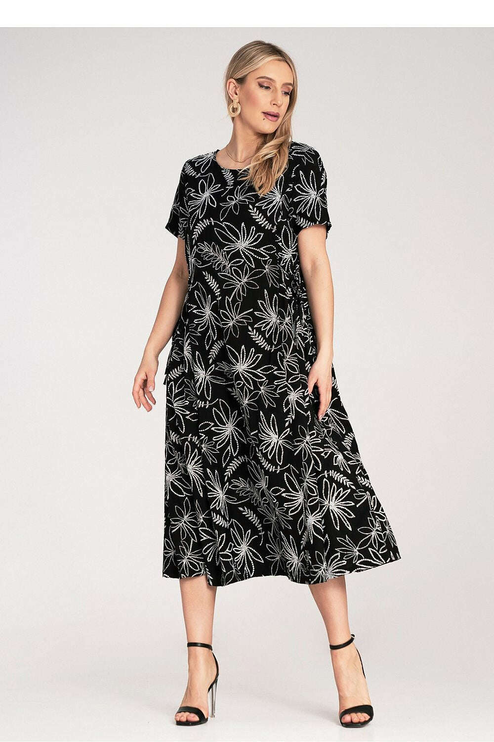 Midi dress with short sleeves and a round neckline, made of lightweight material with a white, embossed floral print. Loose fit with side ties allows to adjust the width at the waist and fit the dress to different silhouettes. The bottom slightly flared, with a horizontal seam adding volume. The model is equipped with practical pockets on the sides.