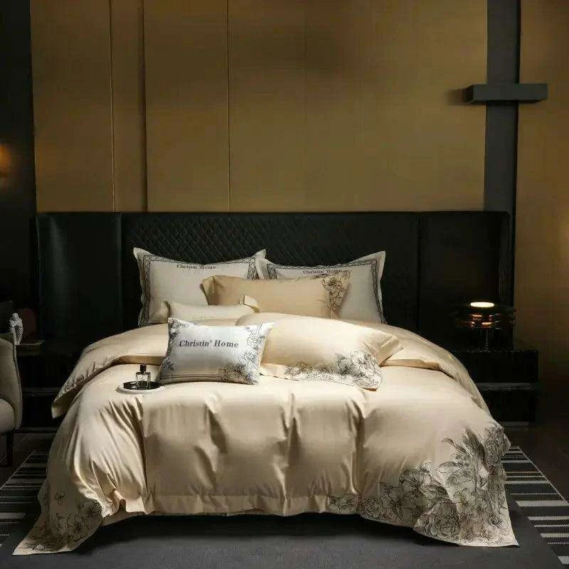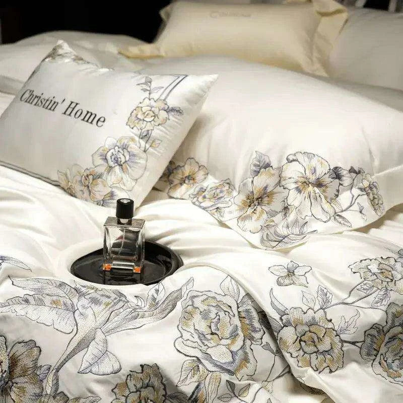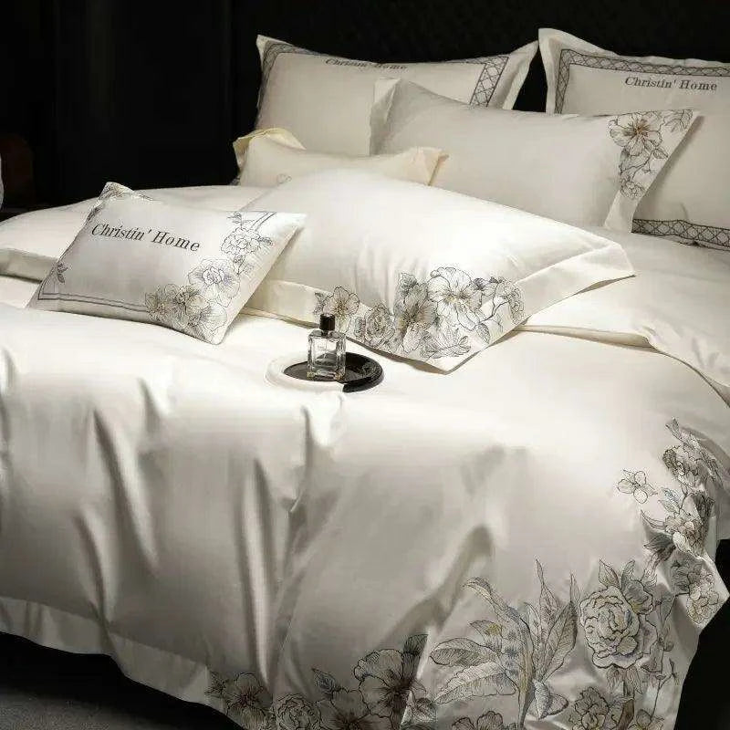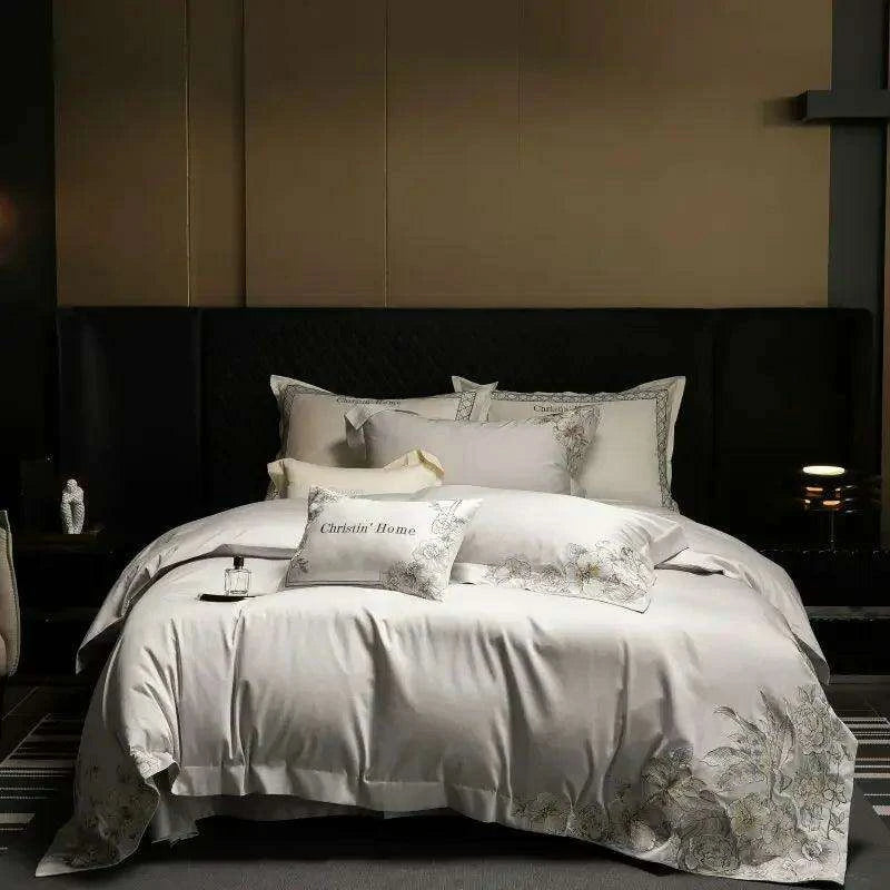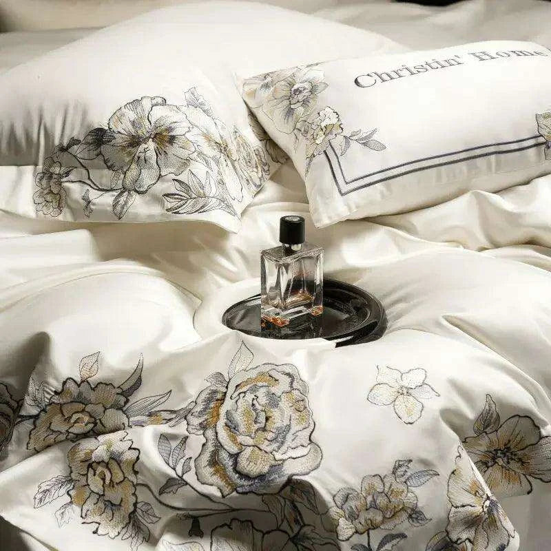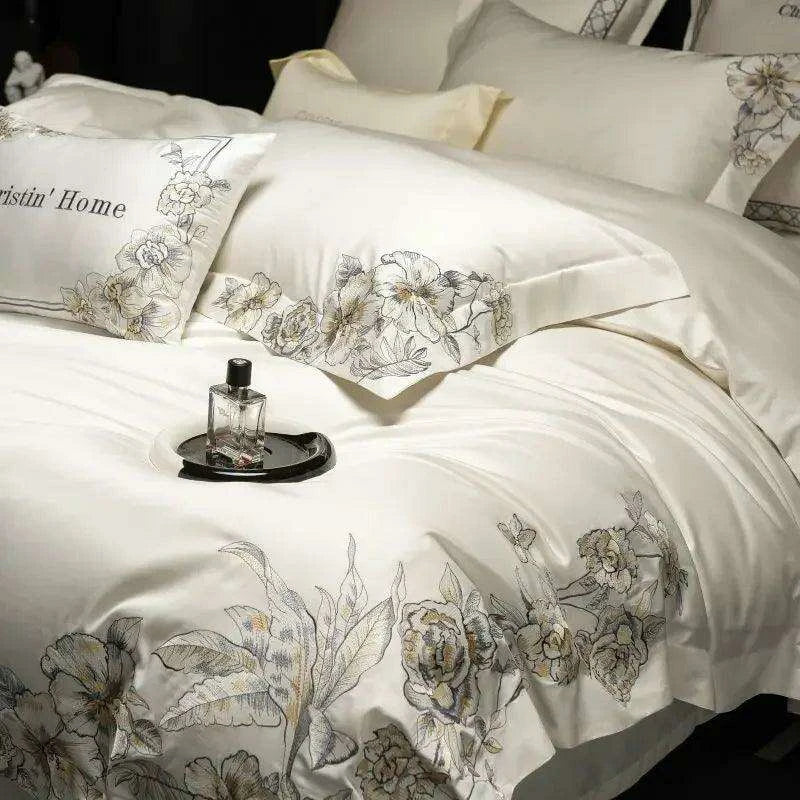 Elegant 1000TC Egyptian Cotton Floral Embroidery Bedding Ensemble with Duvet Cover, Flat Sheet, and Pillow Shams