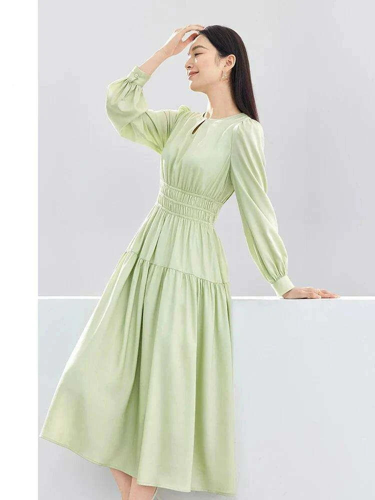 Elegant Light Green Puff Sleeve Midi Dress - Spring Pullover Round Neck for Women 2024
