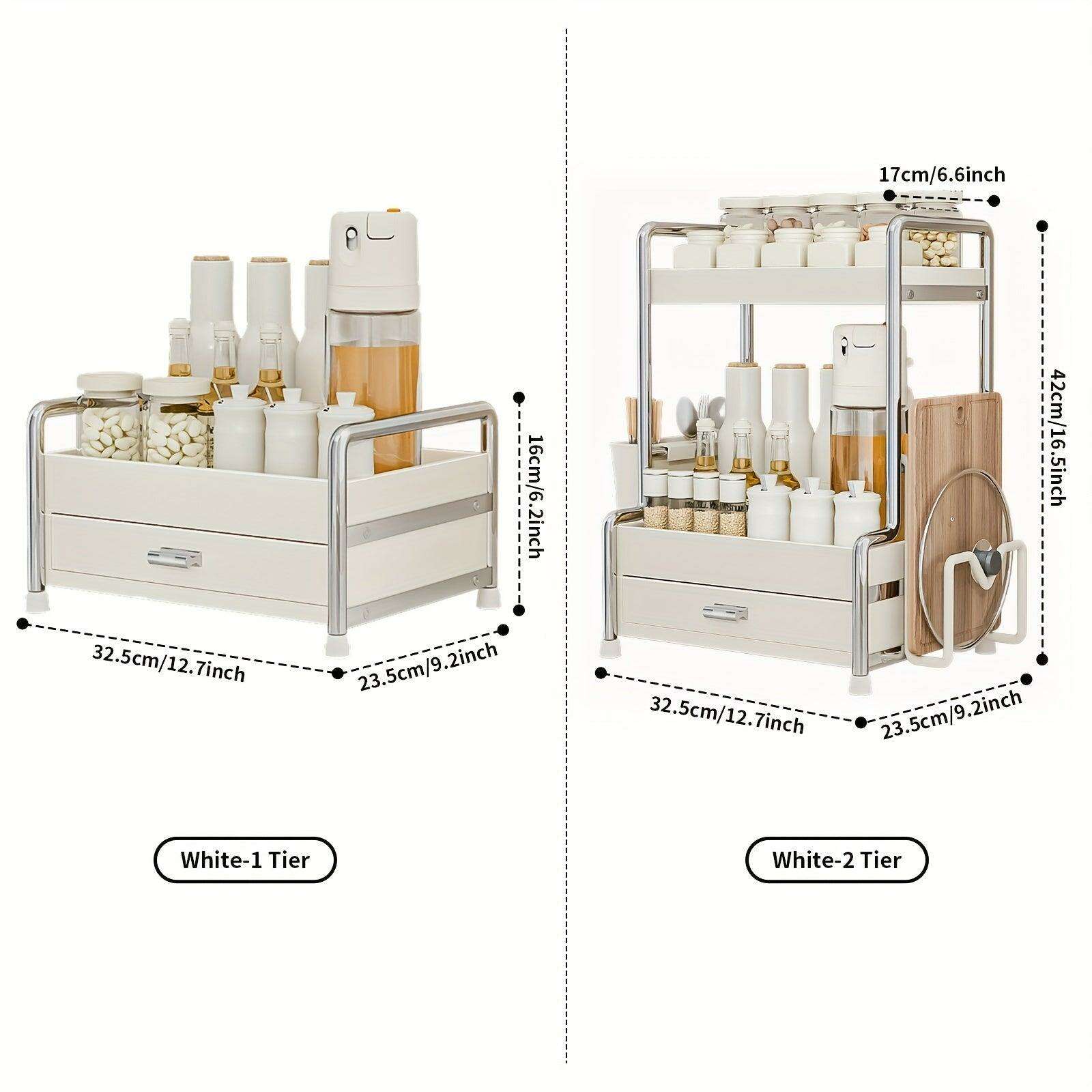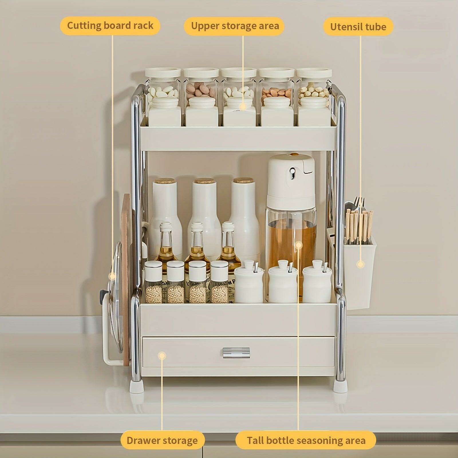 Elegant Milk White Stainless Steel Spice Organizer with Drawers, Chopping Board, and Utensil Holder for Home and Commercial Kitchens