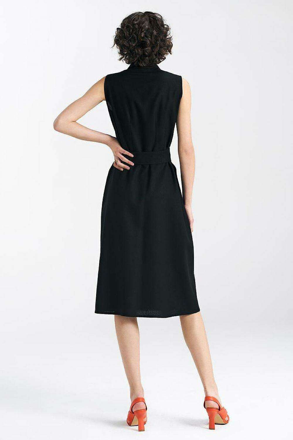 This dress features a sleeveless, midi-length design that flatters a range of figures while remaining versatile enough for the office, events, or weekend outings. The practical snap fastening delivers a secure, smooth closure and a clean line from collar to hem.