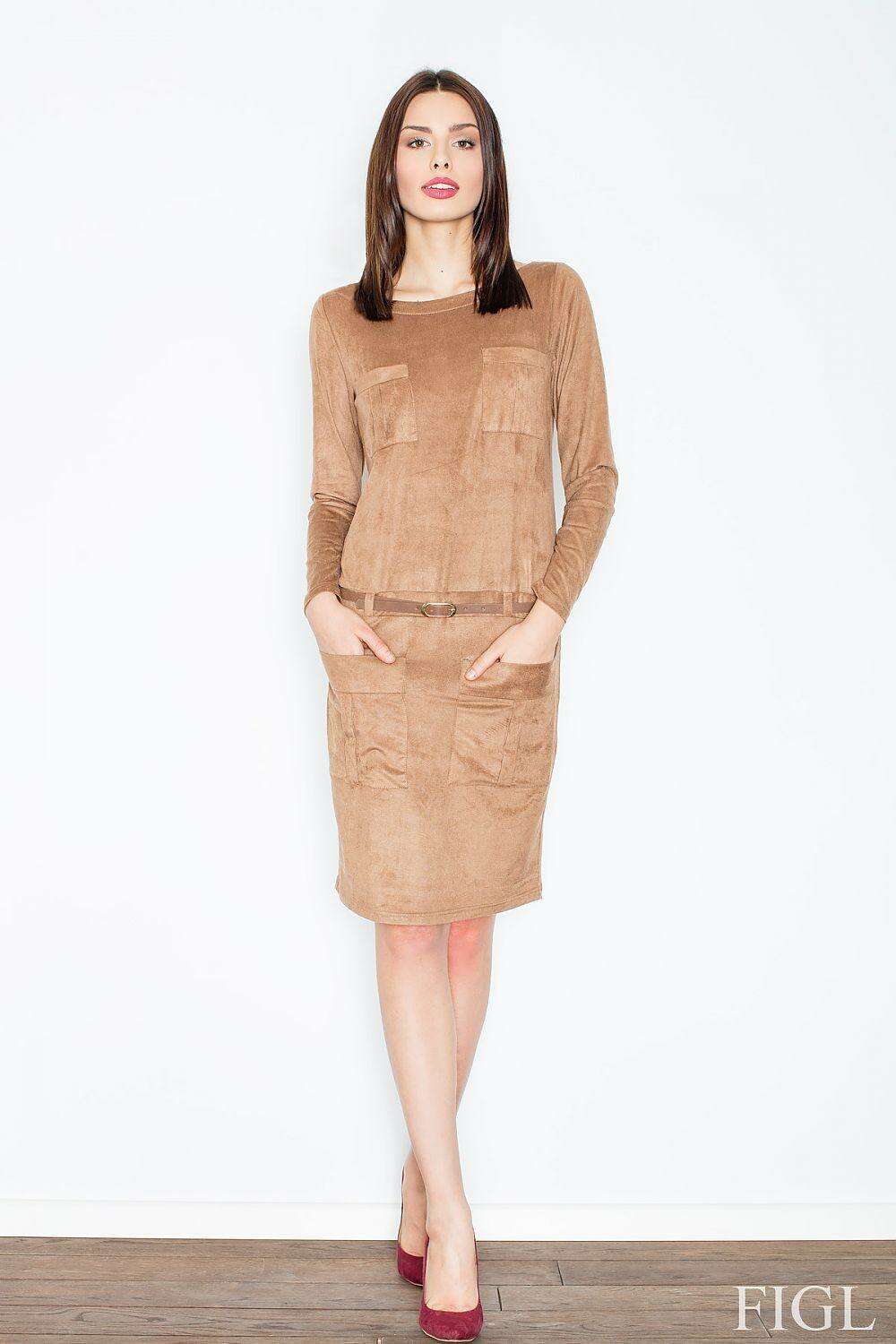 Elegant Suede Mini Dress with Belt and Pockets - Daydress Model 52587 - Très Elite