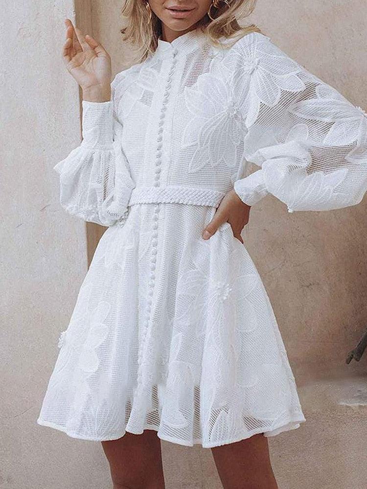 Chic White Embroidered Patchwork Dress with Elegant Stand Collar for Women