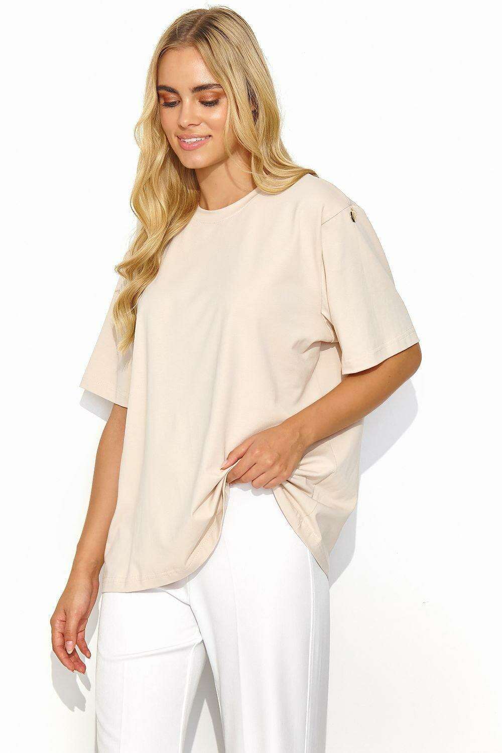 Introducing the Makadamia Cotton Women's Essential T-shirt—a classic wardrobe staple that has been redefined for the modern woman. This t-shirt transcends mere clothing; it is a versatile and stylish essential that pairs effortlessly with your favorite jeans, making it a must-have addition to any wardrobe.