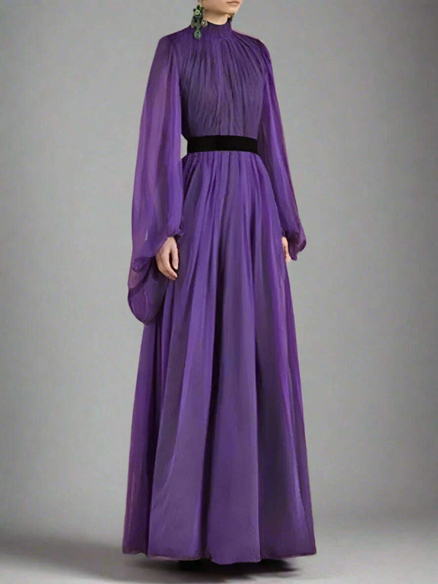 Evening Dress with Lantern Sleeves and Stand Collar for Women