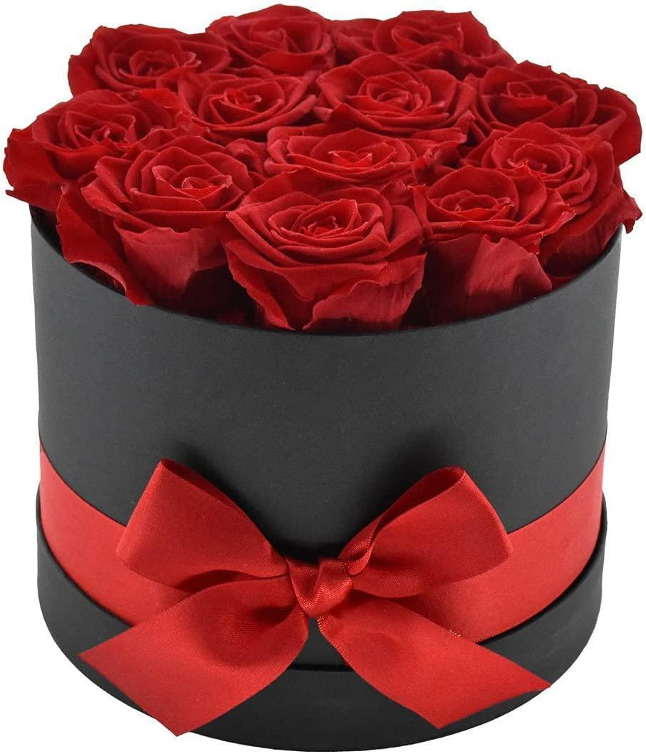 Everlasting Romance: 12 Stem Preserved Red Rose Bouquet in Elegant Round Case- Très Elite- Très Elite