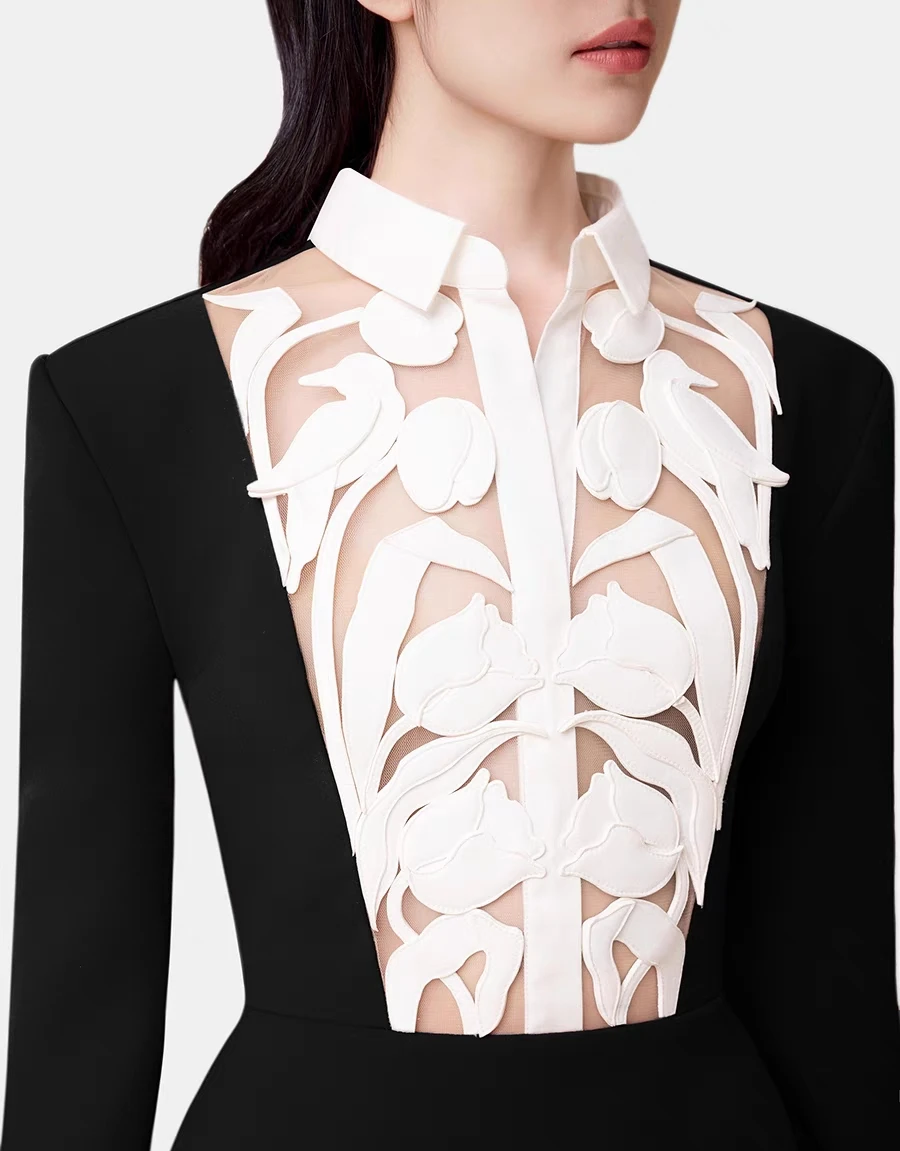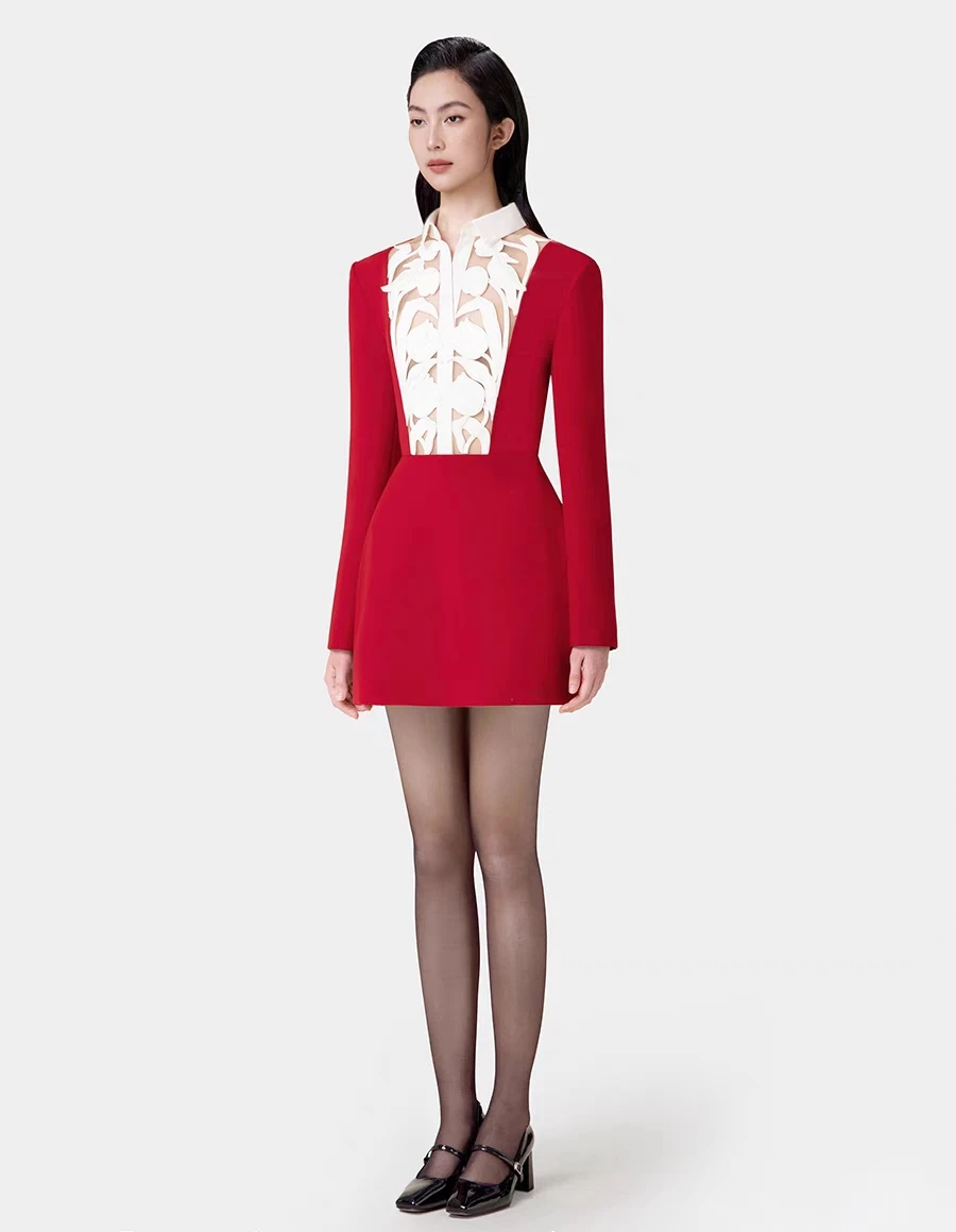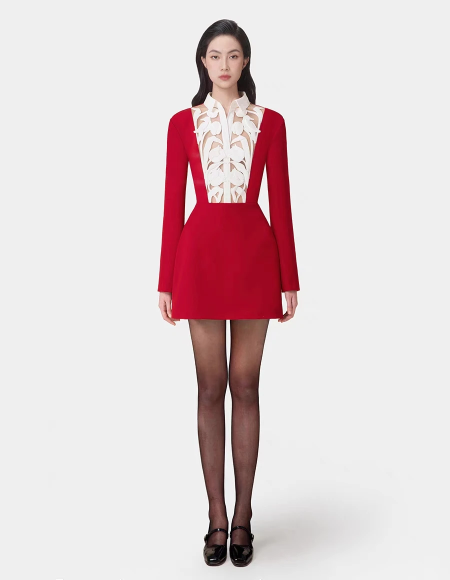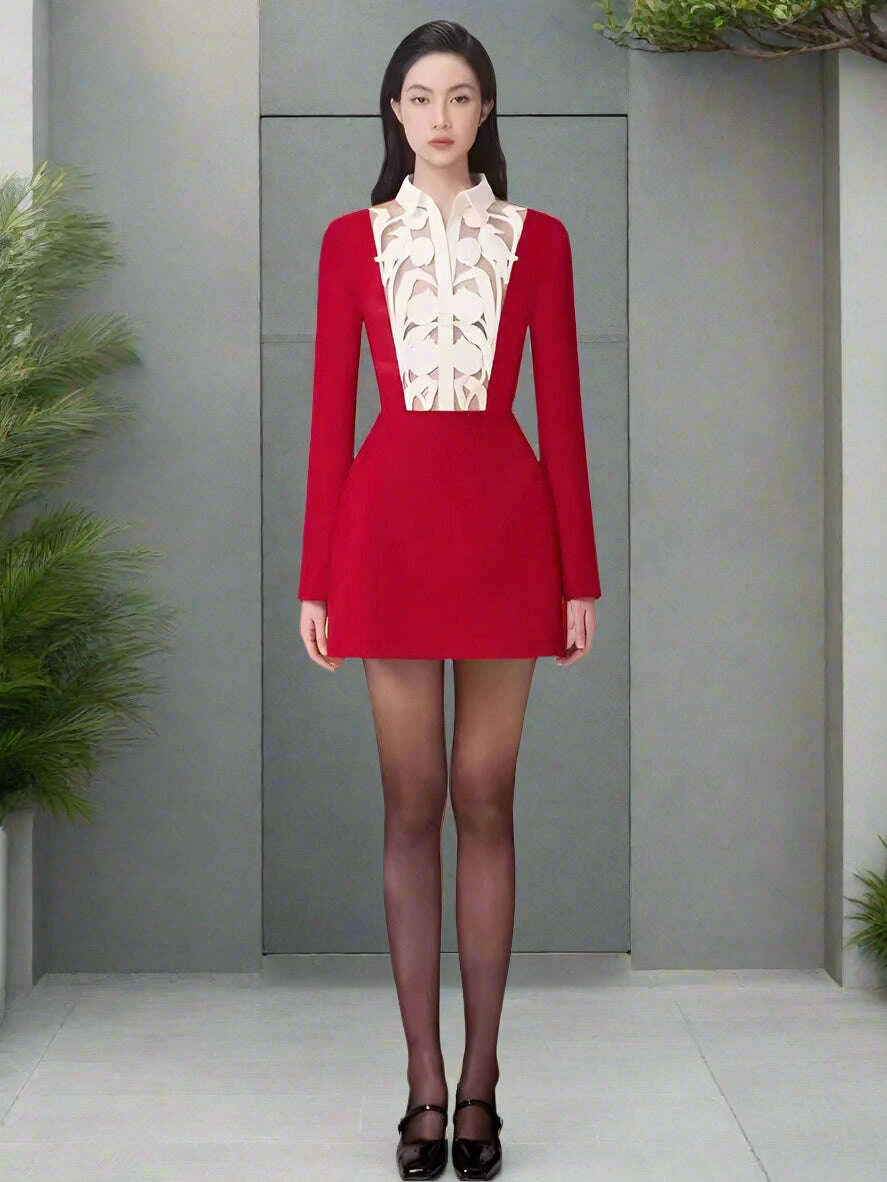 Floral Cut-Out Contrast Mini Dress with Lapel Detail for Women