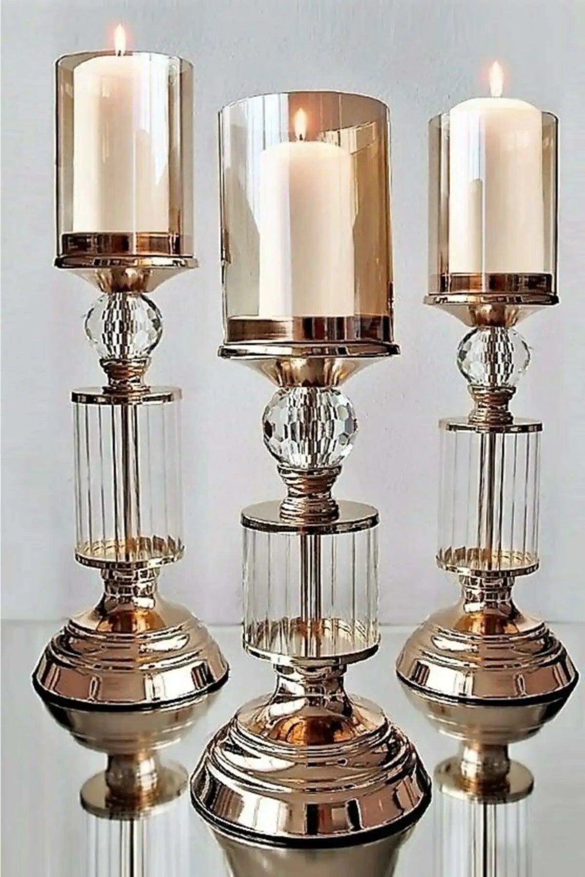 Glamorous Gold Crystal Candle Holder Set - 3 Piece Elegance