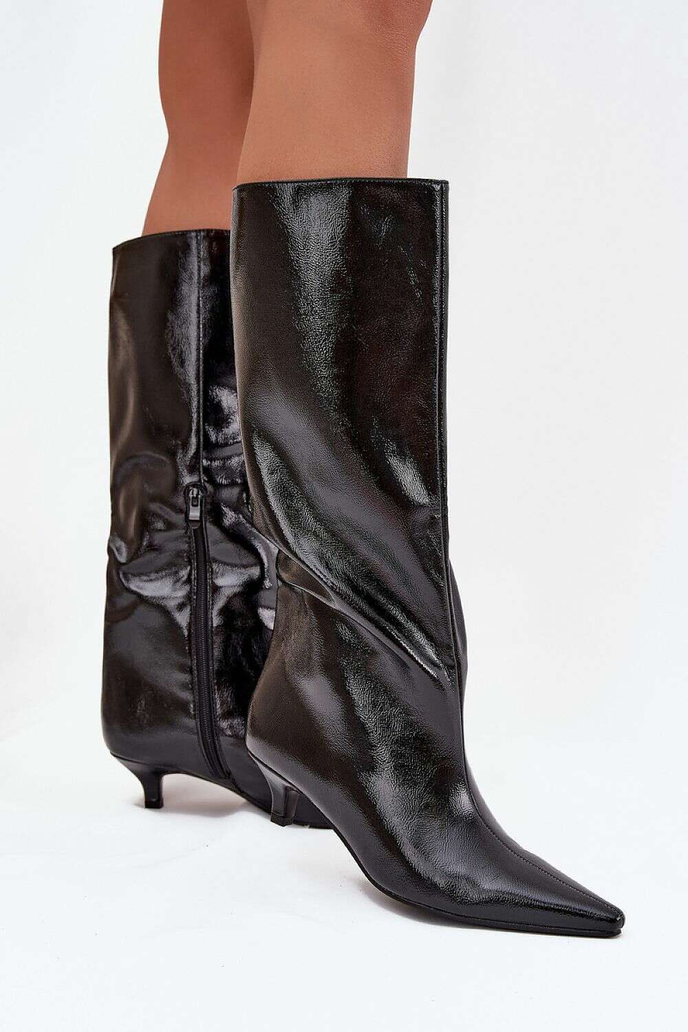 Women's boots made of eco leather are an elegant proposal for the autumn-winter season. A slip-on model with an additional zipper at the bottom of the shaft makes it easier to put on. The interior lined with shoe lining ensures comfort and warmth on cooler days, making the shoes perfect for everyday use. Pointed toes add a slim, feminine character to the whole, while a low heel provides comfort and stability with every step. These versatile boots will complement both casual outfits with jeans and elegant sets with a dress or skirt perfectly.