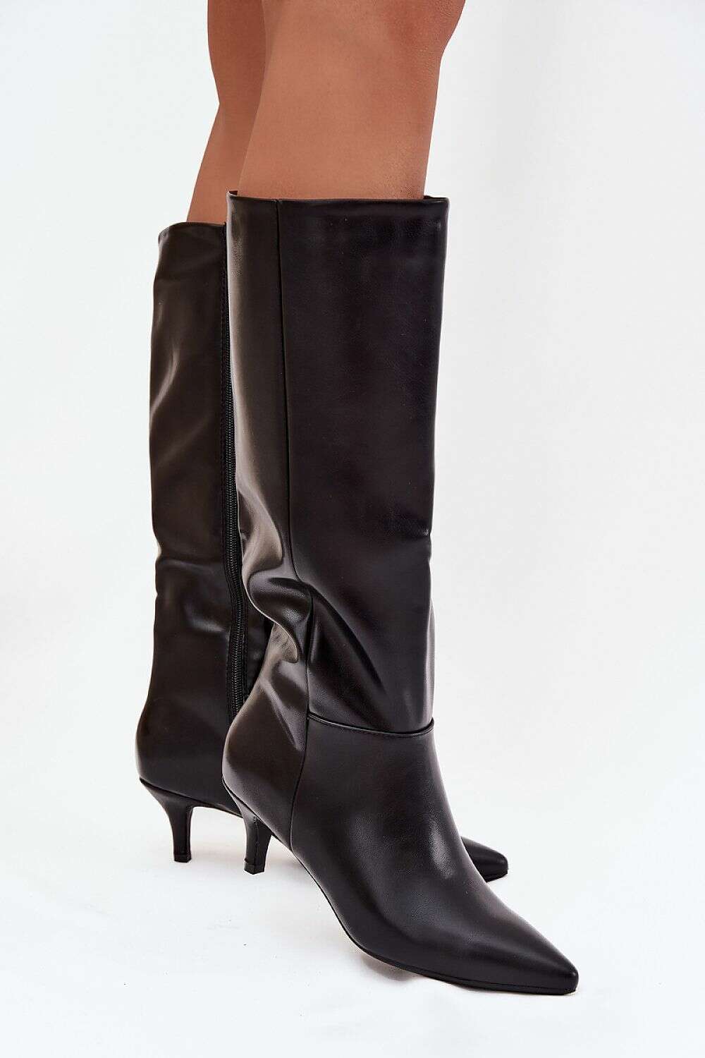 Women's boots made of eco leather are an elegant proposition for cooler days. Set on a low heel, they look subtly and feminine, and pointed toes add chic and visually slim the silhouette. The interior lined with a shoe lining provides comfort and warmth, making the shoes perfect for the autumn-winter season. This model is ideal for both everyday and elegant stylizations.