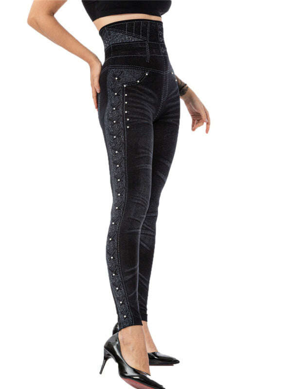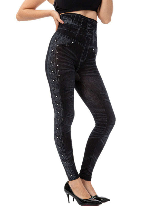 High waist beaded leggings stretch slim cropped pants