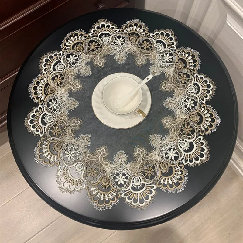 - Transparent ground — lets the natural beauty of your table surface show through while adding a refined lace overlay; works over wood, marble, glass, and painted surfaces